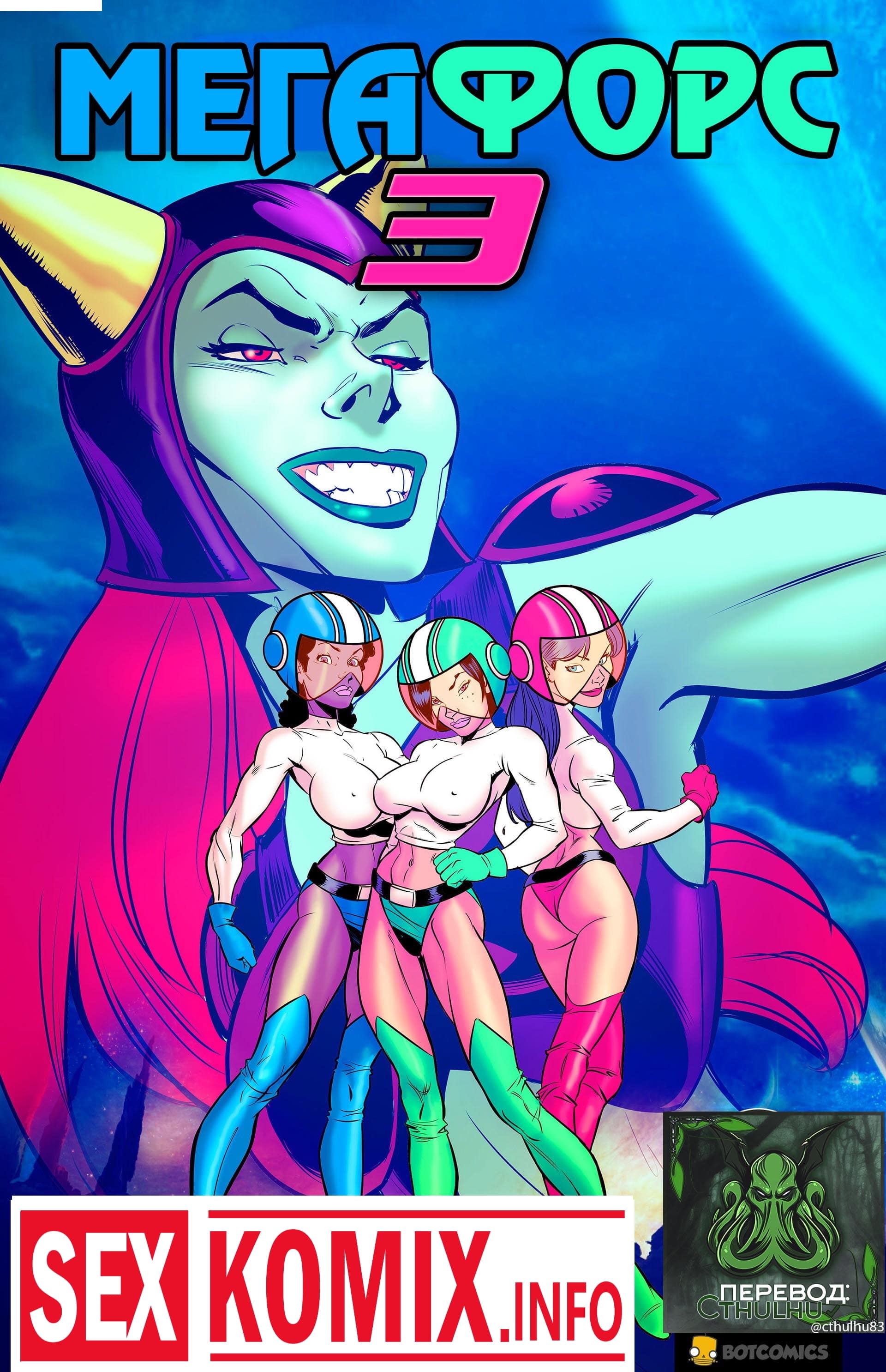 Порно комикс Мегафорс. Команда девушек с большими сиськами, обладающие супер способностями вступили в схватку с огромным грязевым монстром, который напал на город. Одна из этих красоток умеет становится гигантом она выросла до размеров здания и дала бой монстру. Вся одежда на ней порвалась, и девушка стала абсолютно голой, все жители города смотрели на огромную киску и большие сиськи.