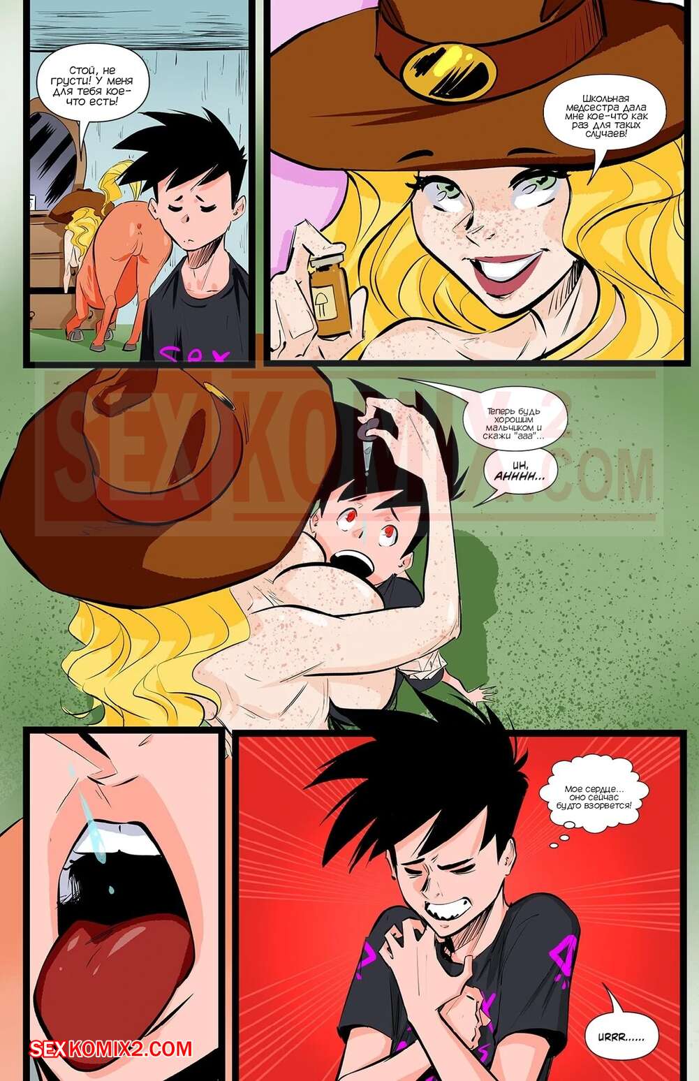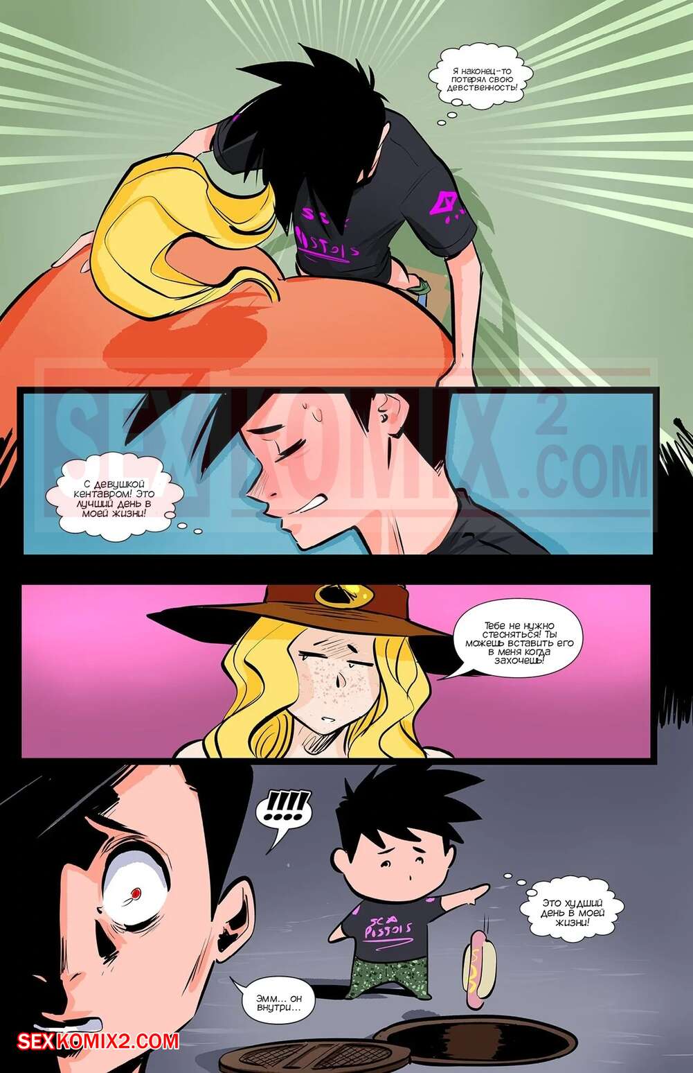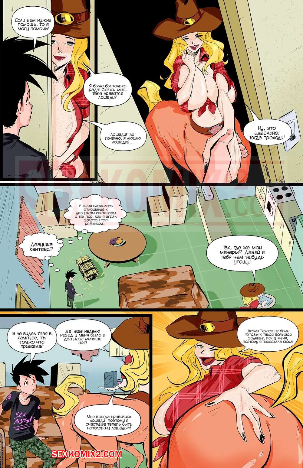Порно комикс Академия девушек монстров. Часть 7. Monster Girl Academy. Worky Zark Парень услышал звуки с соседней комнаты и пошел предложить помощь. Там его встретила девушка кентавр, которая пригласила его к себе, чтобы он ее хорошенько выебал.