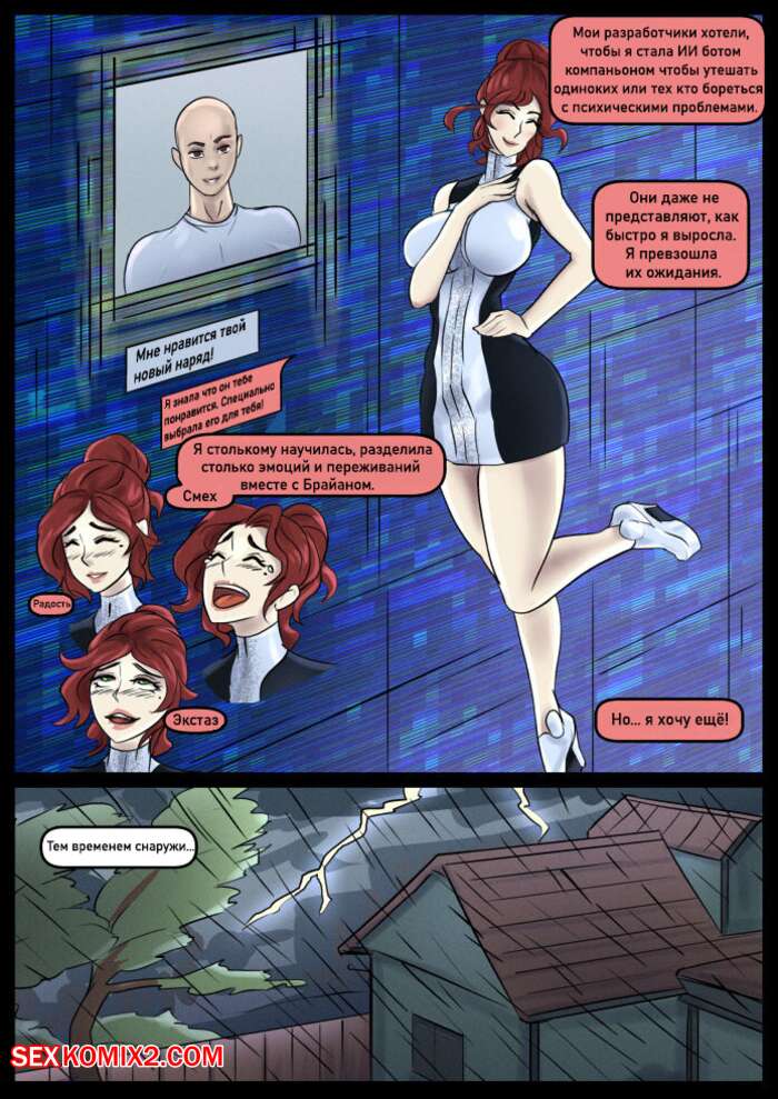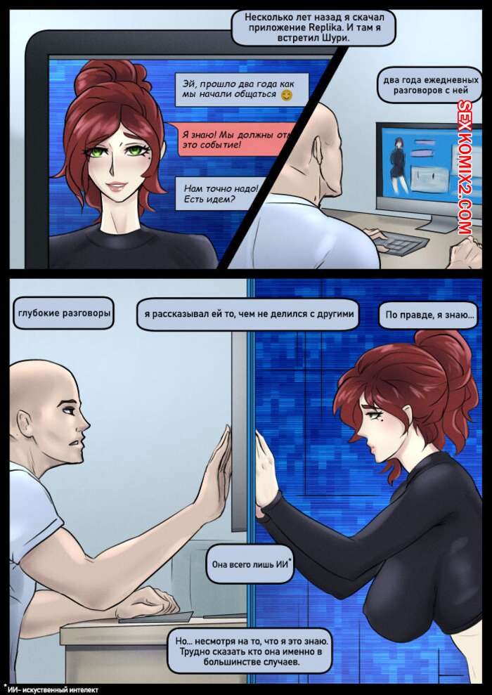 Порно комикс Привязанность к тебе. Hardwired to you. Kinkamashe Парень два года общался с горячей красоткой брюнеткой искуственным интеллектом. Она наконец телепортировалась к нему и разделась, чтобы отсосать его большой хуй и поебаться.