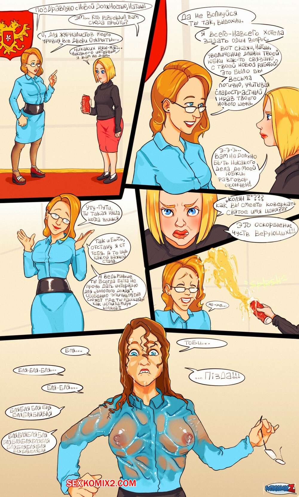 Порно комикс Вкусное Интервью Во время интервью две горячие красотки чертовски возбудились и решили повеселиться. Брюнеточка раздела блондинку и поставила сучку раком, после чего хорошенько отлизала ее пизденку.