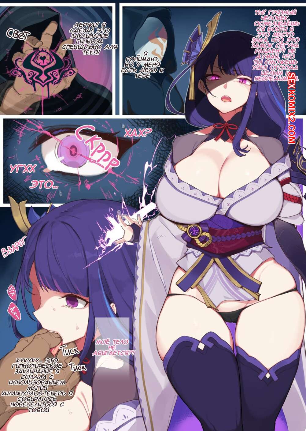 Порно комикс Гипноз сёгуна Райден. Saimin Ochi Dogeza Shogun. Горячая брюнетка с большими сиськами попала под гипноз сильного мага. Теперь девушка стала как кукла, с ней можно делать что захочешь.