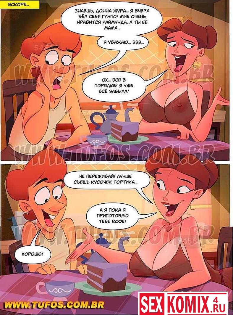Порно комикс «Деревенская семейка. Часть 19. Бодрящий кофе». Смотрите продолжение секс комикса о похотливой теще, её дочери и её зяте. Зятёк пришёл извинится за то что было на озере, но развратная теща истосковавшаяся по сексу, снова соблазняет его.