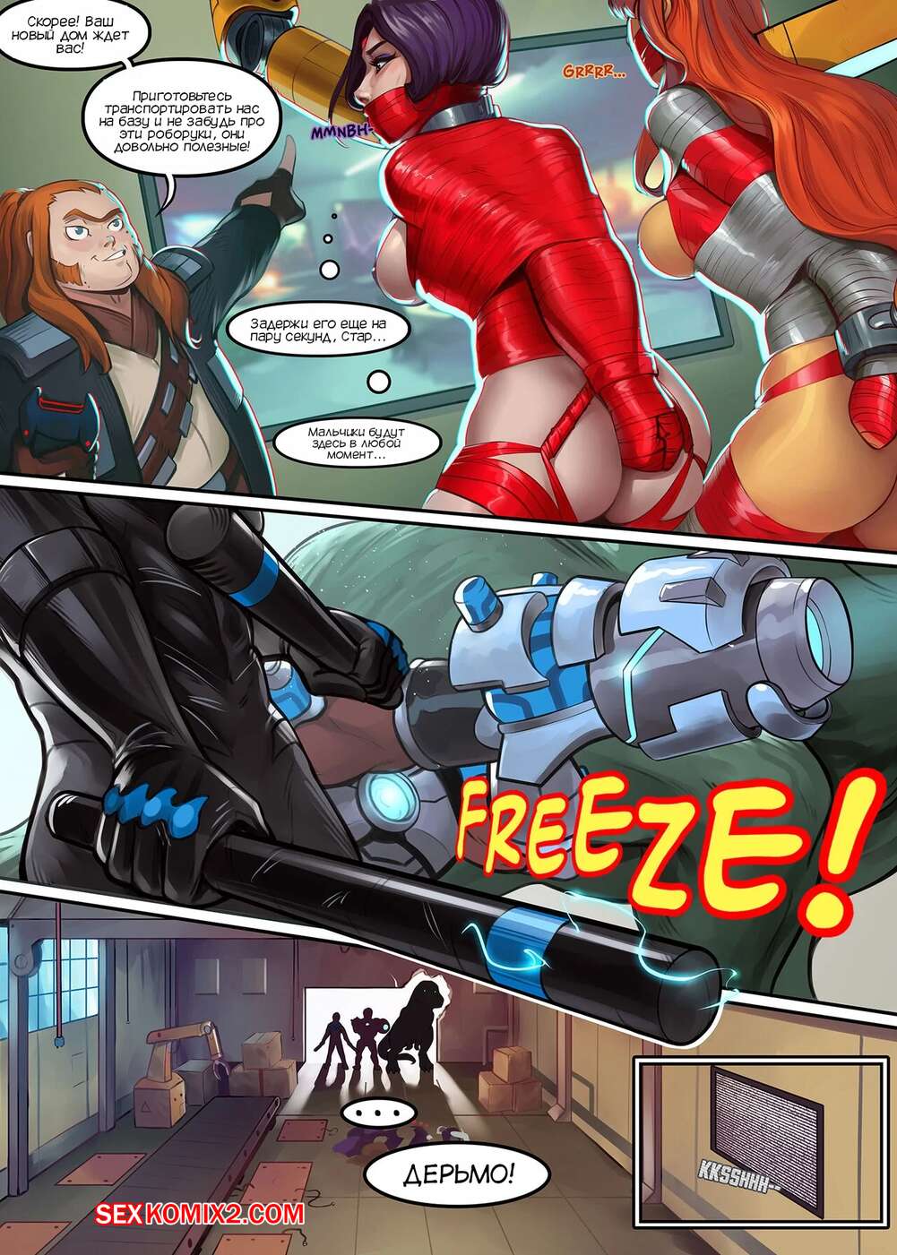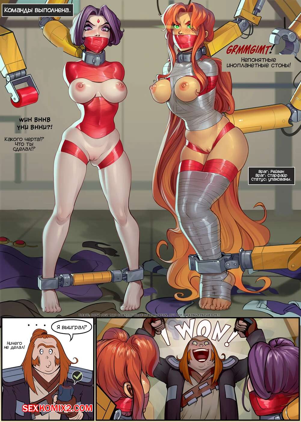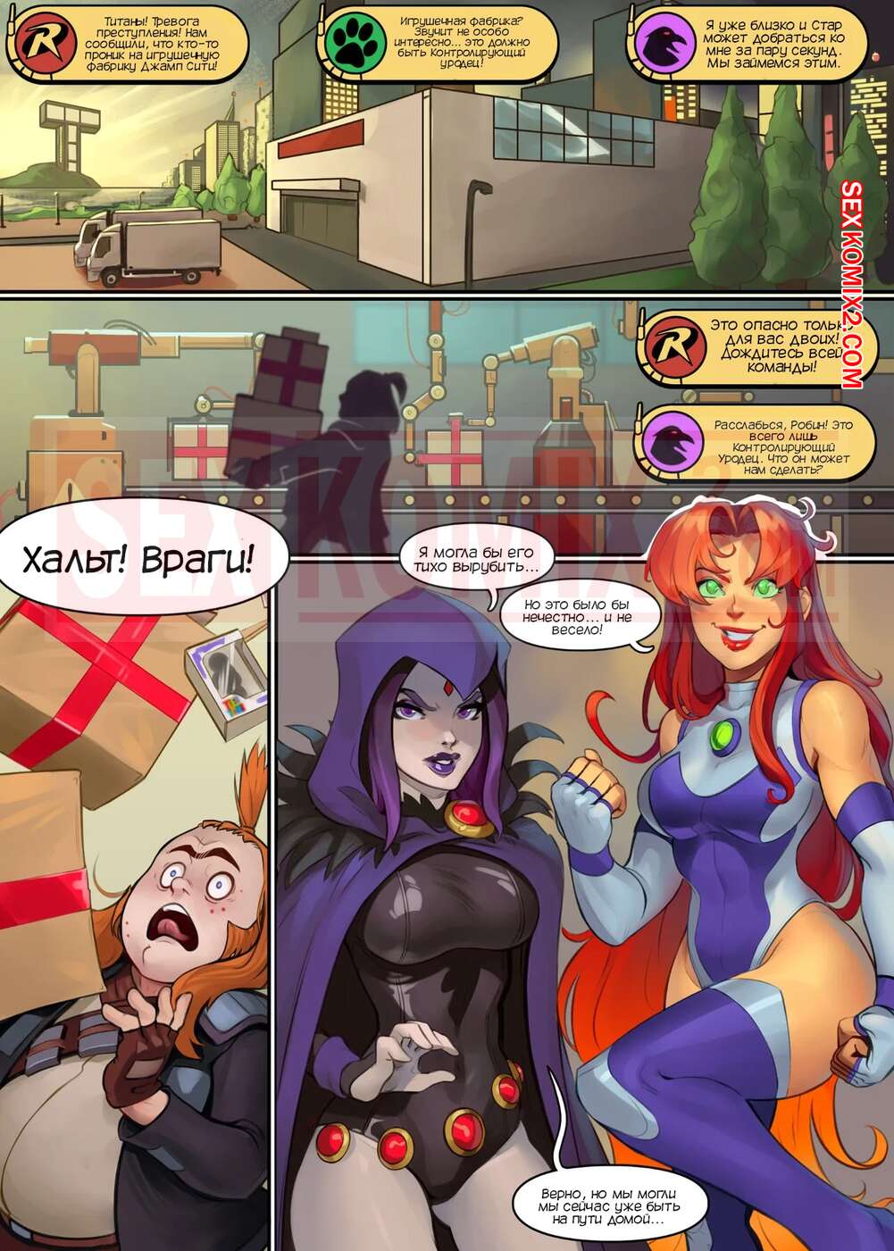 Порно комикс Титаны. Экшнигрушки. Action Toys. SanePerson Титаны получили сигнал о преступлении на фабрике игрушек. Рейвен и Старфайр отправилась туда, где они попали в ловушку злодея, и их схватили металлические клешни, которые стали раздевать девушек.