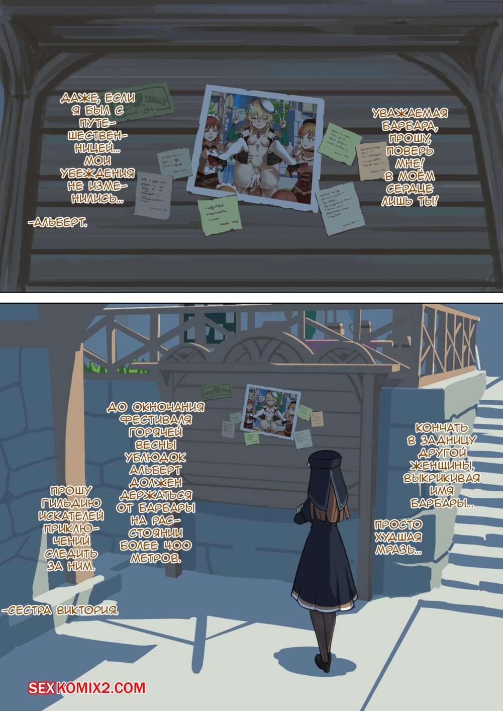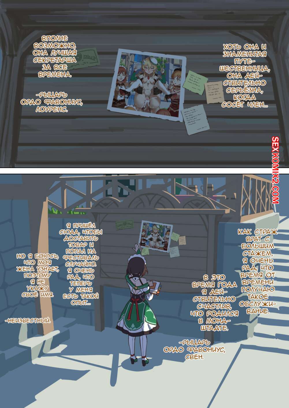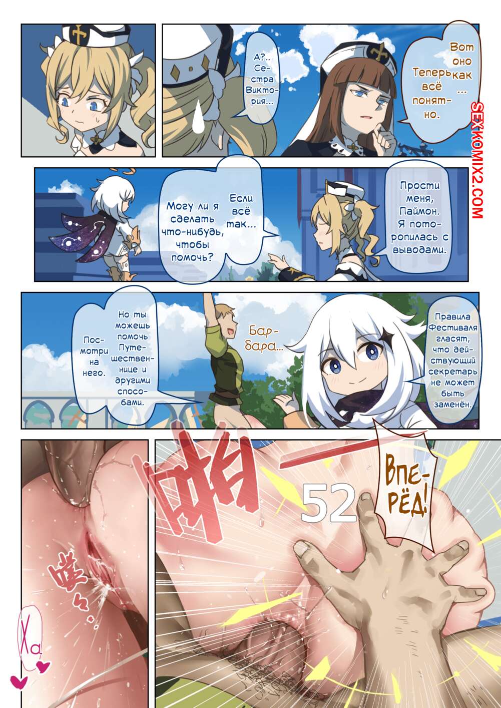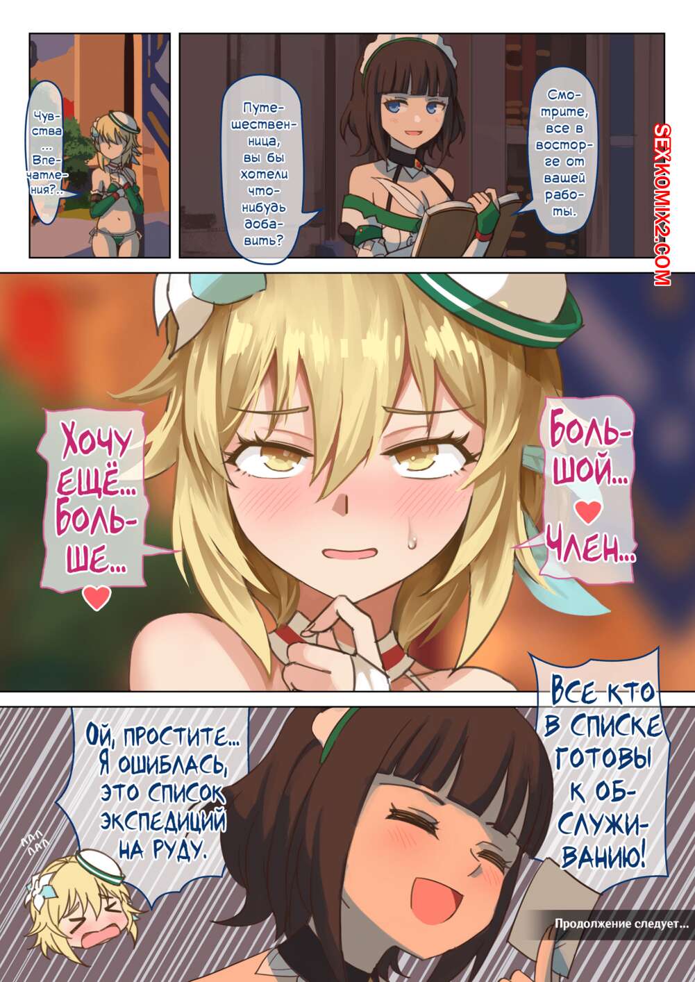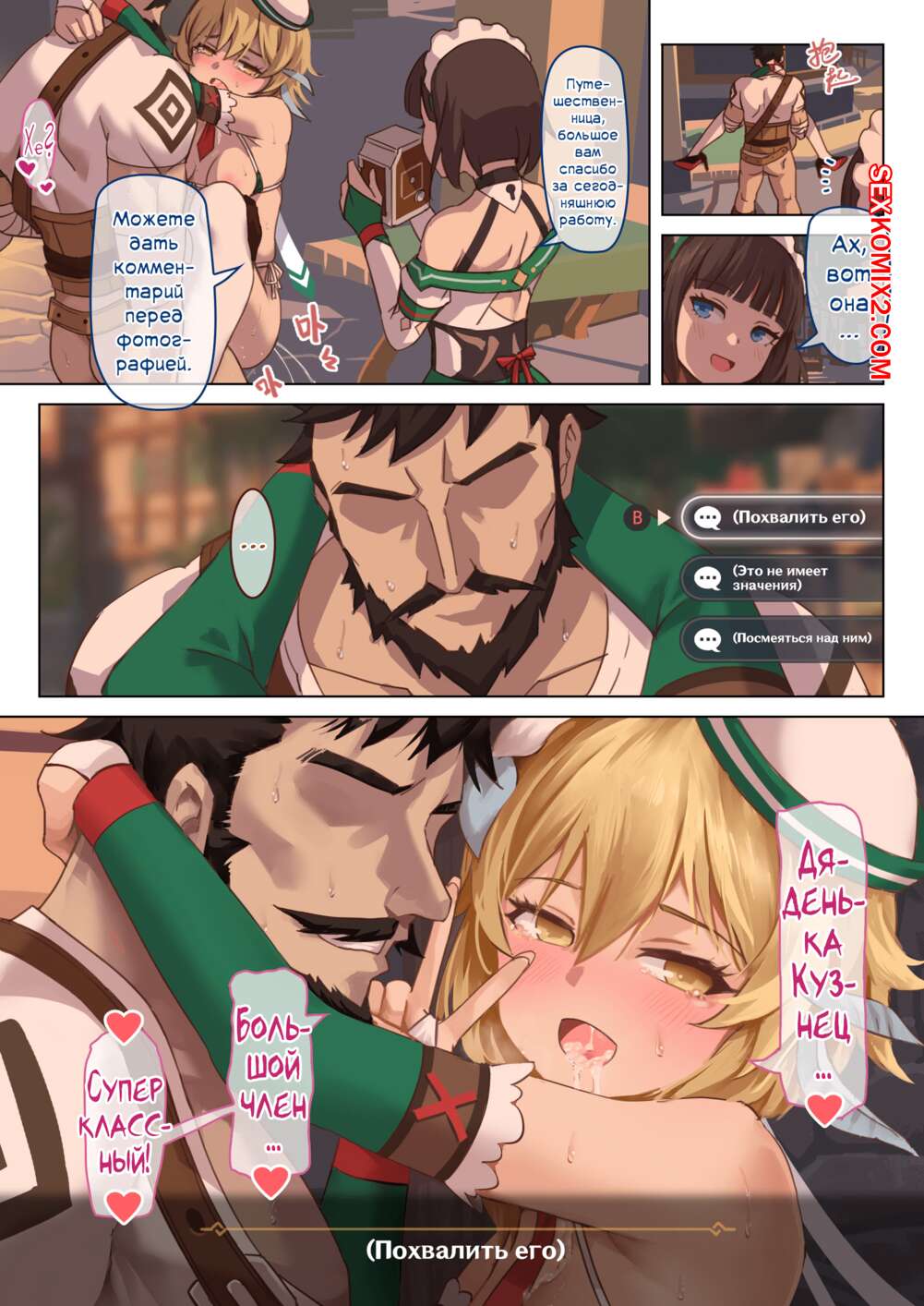 Порно комикс Genshin Impact. Часть 1.5. Мондштадтский фестиваль горячей весны Горячая сисястая блондинка привлекает внимание многих парней. Они раздевают девушку и дают ей отсосать свои большие хуи, после чего ебут их во все дырочки, получая огромное удовольствие.