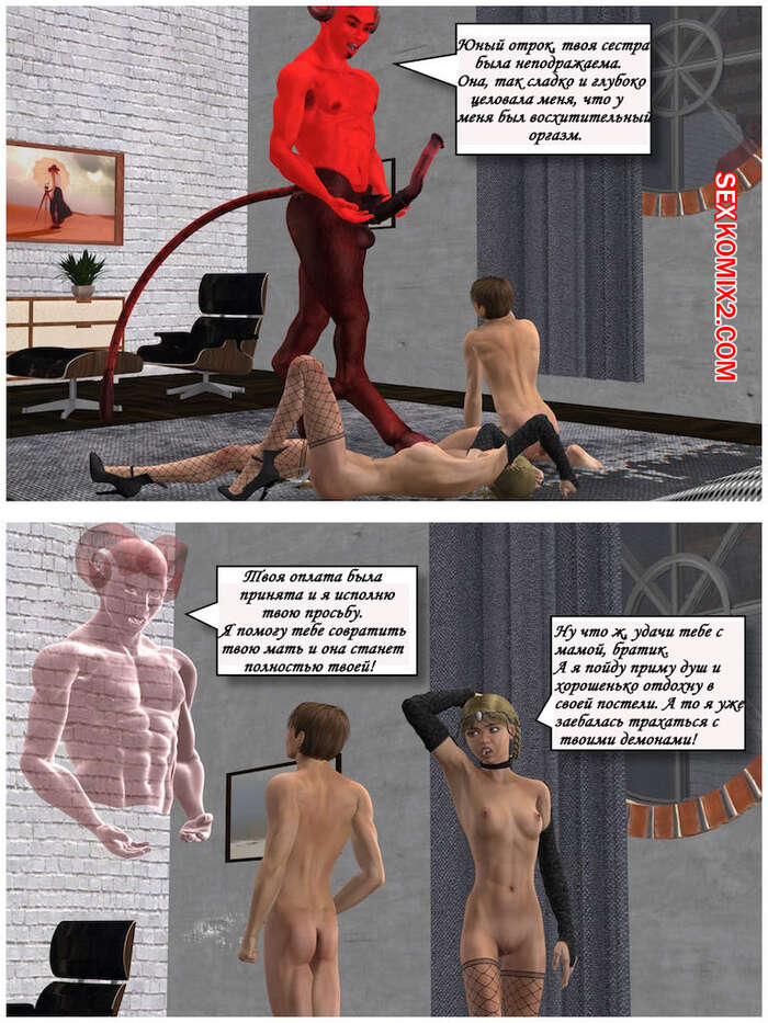 Порно комикс Близнецы и Суккуб. Часть 2. The Twins and The Succubus Парень веселился со своей сестренкой в ее комнате, но к ним неожиданно прибыла девушка суккуб. Она соблазнила подростков, чтобы заняться с ними страстной групповой еблей.