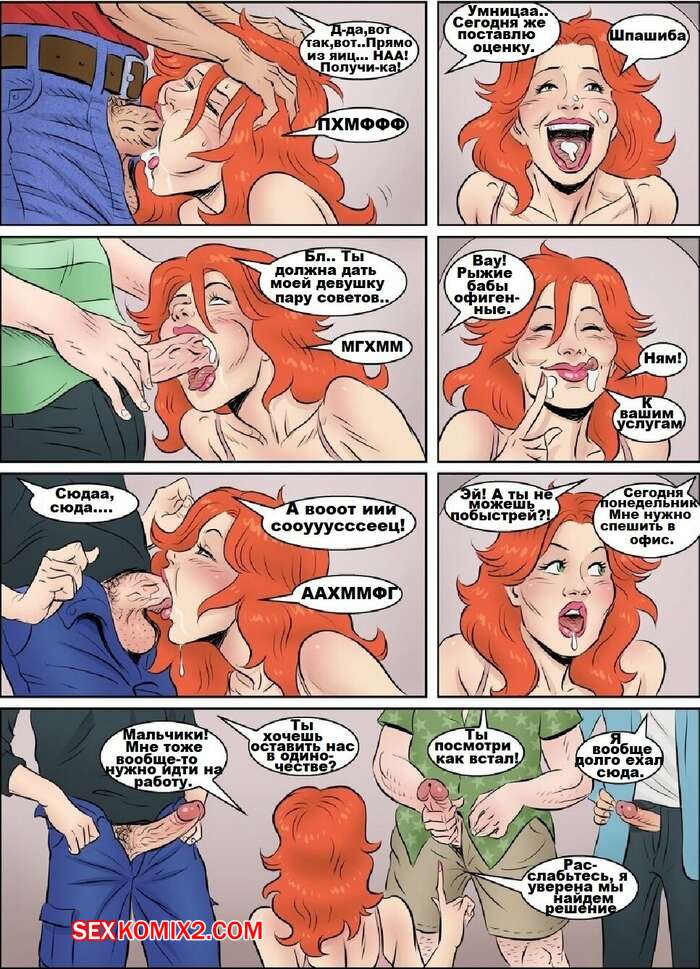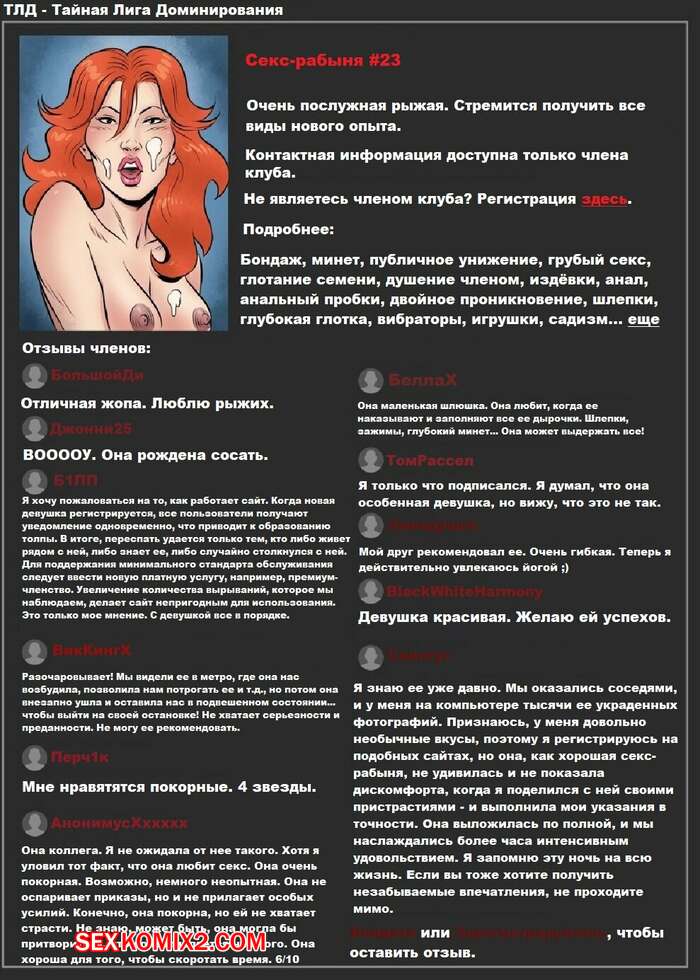 Порно комикс Тайная лига доминирования. Часть 2. Новая жизнь Мужики пользуются шикарным телом горячей рыжей красотки. Они раздевают ее и дают ей отсосать свои большие хуи, после чего хорошенько ебут ее во все дырочки, получая огромное удовольствие.