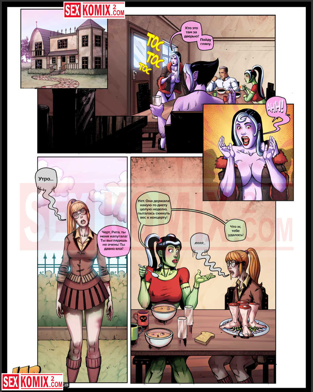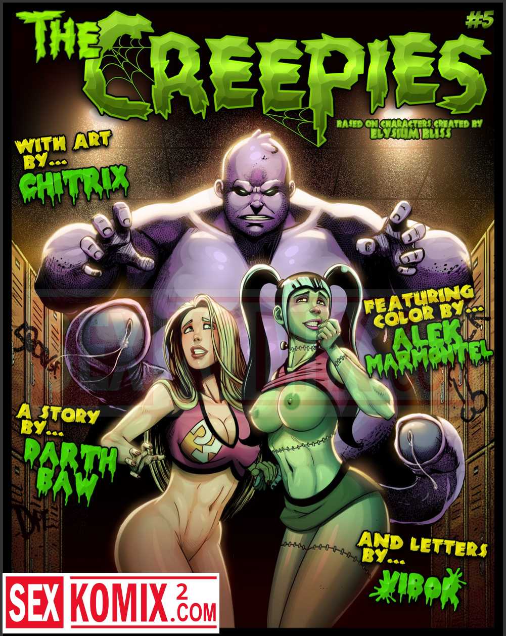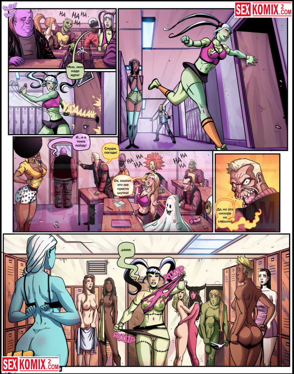 Порно комиксы The Creepies. Часть 5. На русском. Жизнь студентов из мира монстров не сильно отличает от привычной нам, они также заводят друзей и занимаются сексом. Девушка студент познакомилась с парнем и занялась с ним сексом в раздевалке.