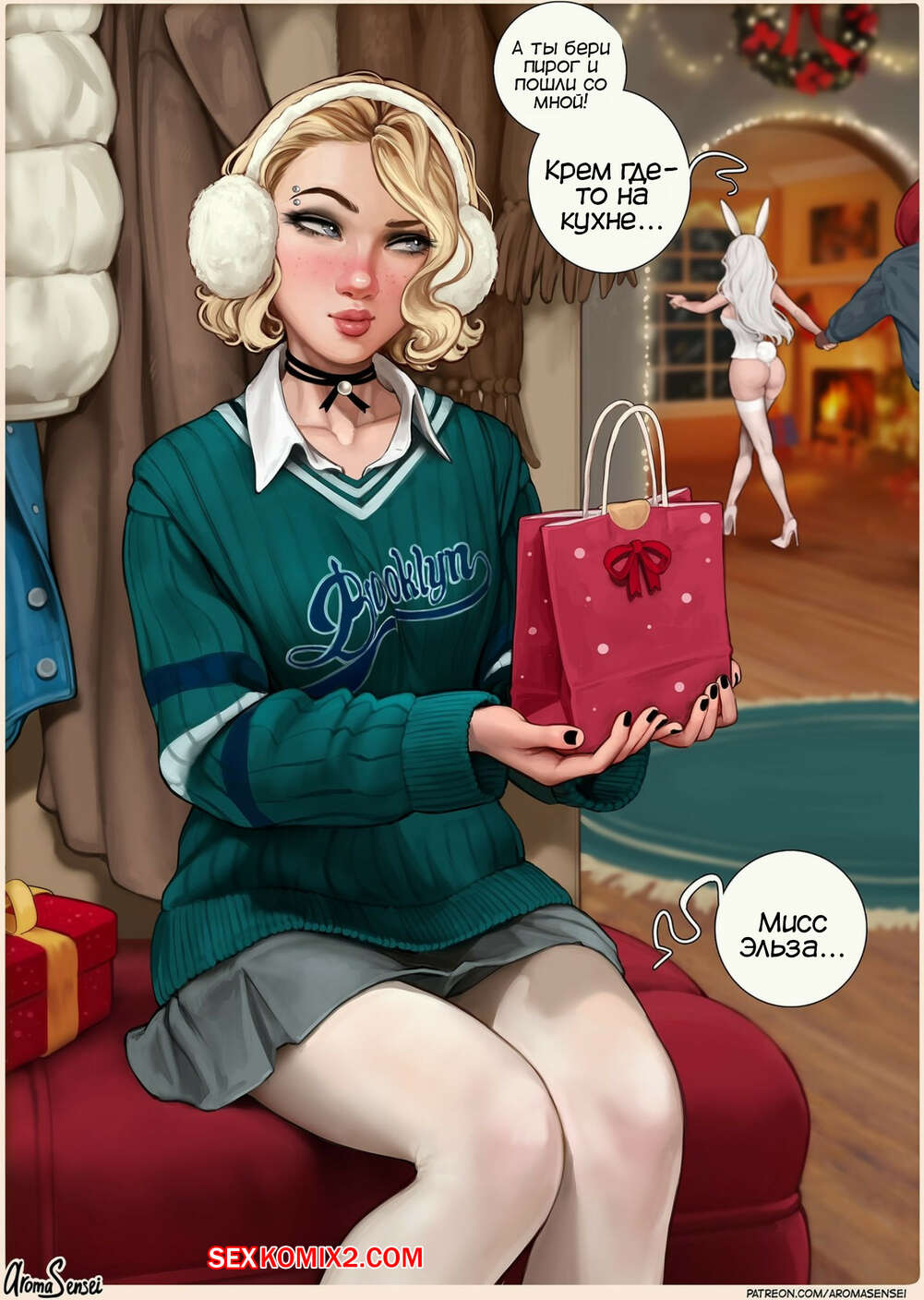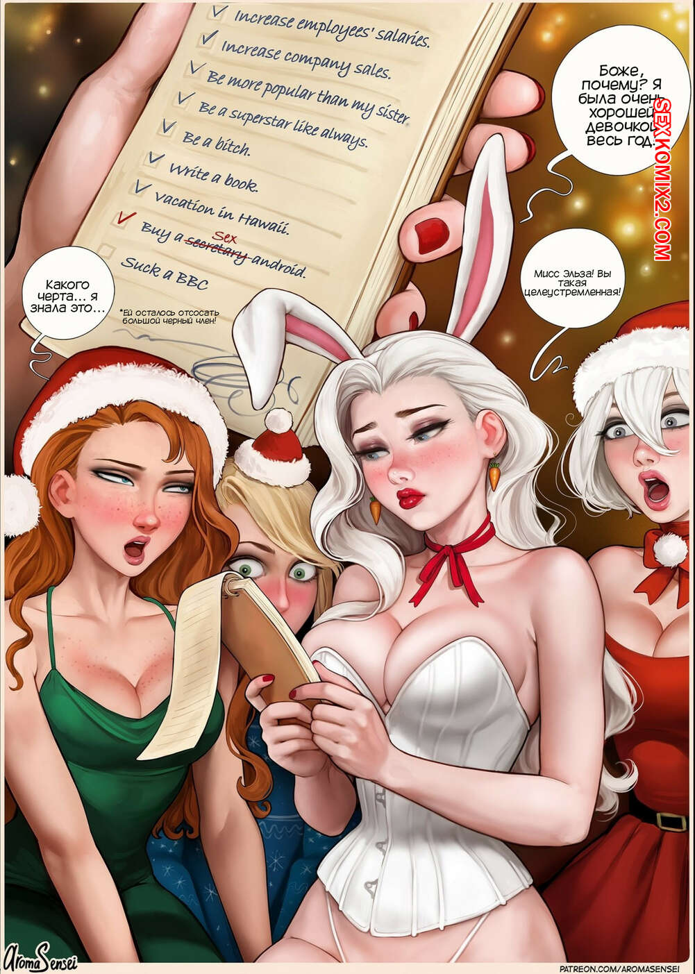 Порно комикс Frozen Inc. Рождественская вечеринка 2022. Christmas Party 2022. Aroma Sensei Сисястая блондинка Эльза пригласила к себе домой своих коллег, чтобы вместе с ними отпраздновать Рождество. Ей не хватало отсосать большой черный член, чтобы выполнить свой список желаний на год. К счастью Гвен привела своего парня Майлза..