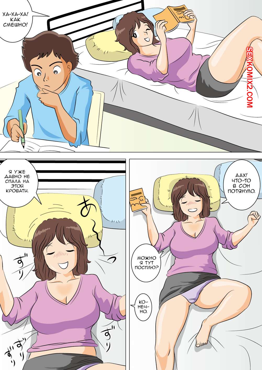 Порно комикс Снова это делаем. Doing it again. Yarinaoshi Сисястая милфа брюнетка была очень возбуждена и решила повеселиться с молодым пареньком. Она разделась перед ним и стала сосать его большой хуй, после чего дала ему себя выебать.