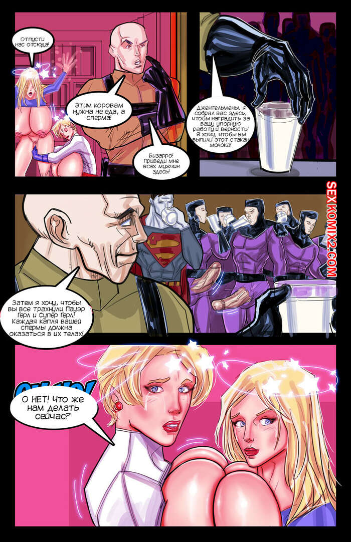 Порно комикс Лига Справедливости. Молочная горничная из стали. Super Poser Горячие сисястые блондинки супергероини боролись с Бизарро, но он их одолел и теперь красотки оказались в плену у Лекса Лютора. Он начал доить из девушек молоко и трахать их вместе со своими солдатами.