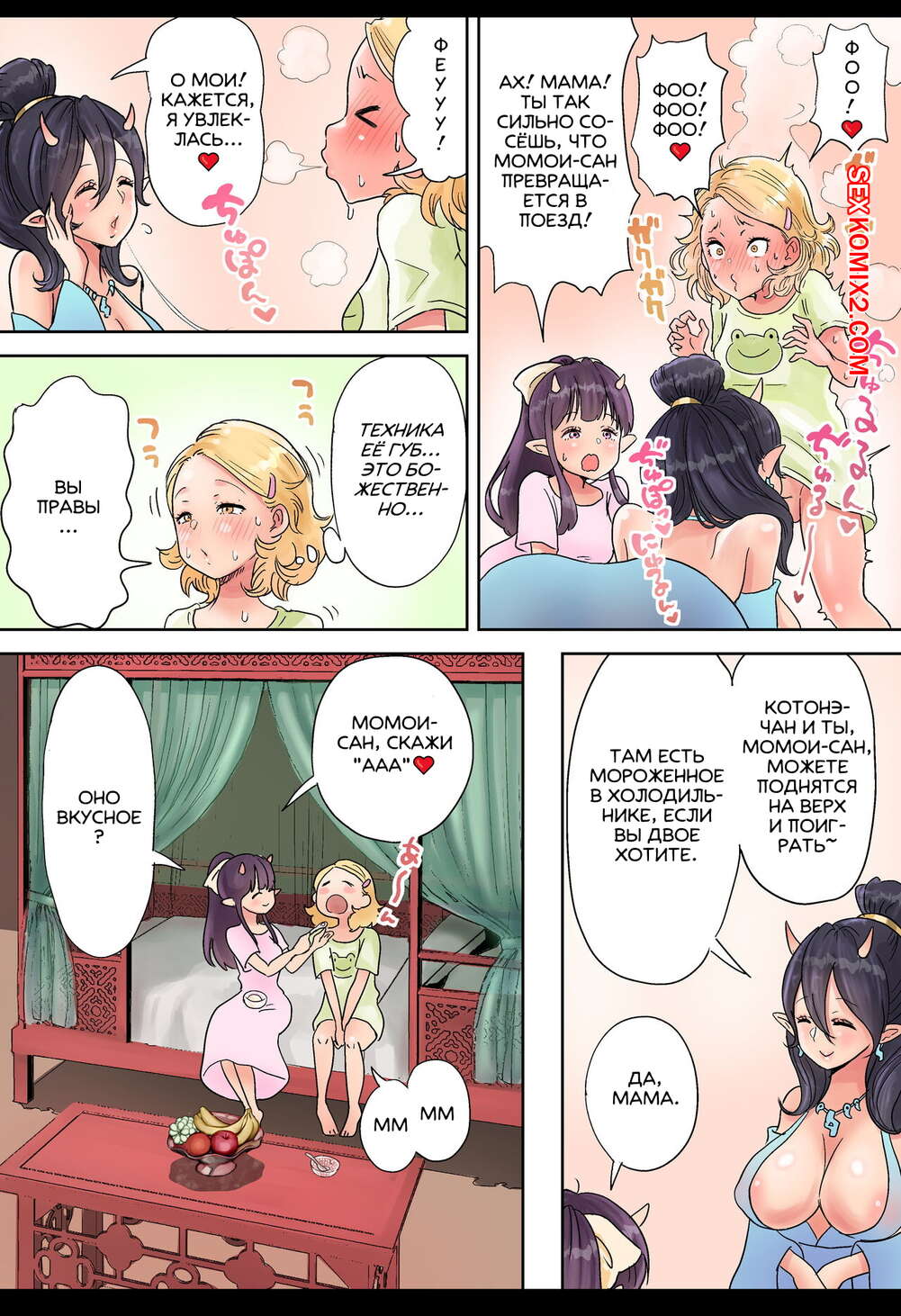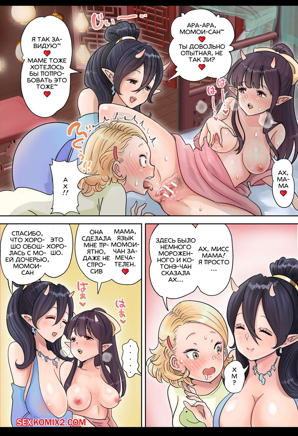 Порно комикс Futanari x Oni Mother and Daughter. Tsubame Горячие сисястые красотки были очень возбуждены и хотели трахаться. Девушки разделись и стали ласкать друг дружку, после чего занялись страстной групповой еблей.