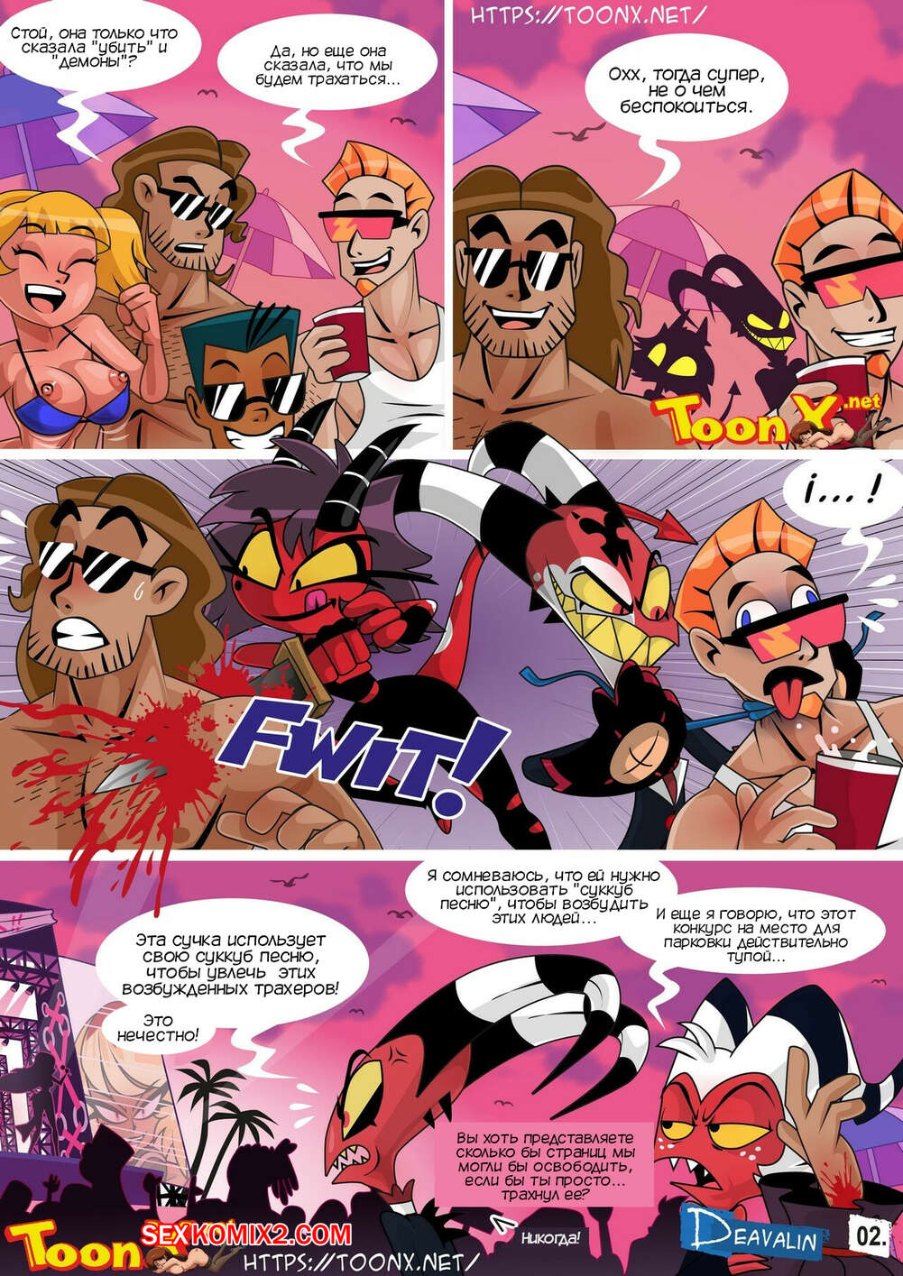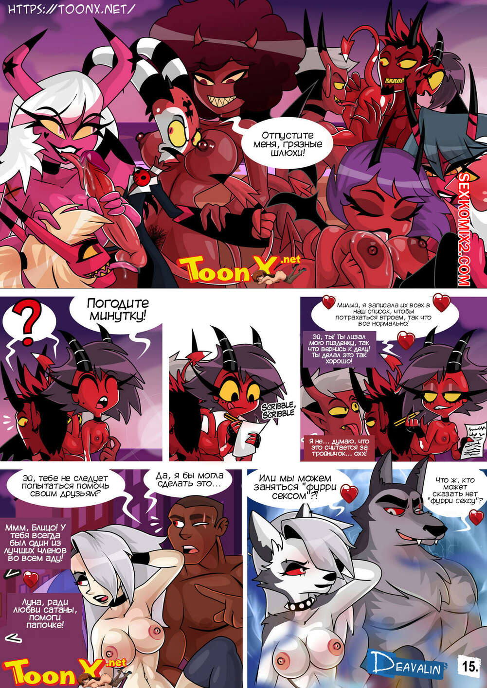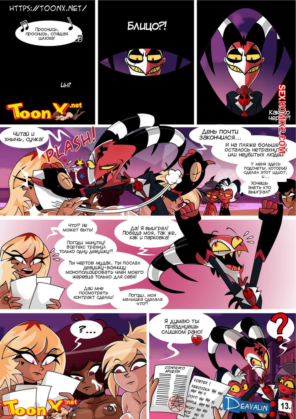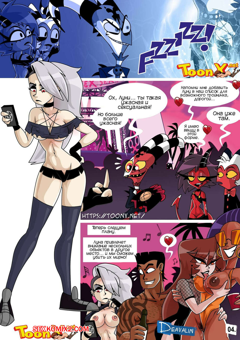 Порно комикс Адский босс. Веросика. Helluva Boss Verosika. Deavalin Горячая сисястая блондинка устроила концерт, чтобы устроить там огромную оргию и выиграть в споре со своим бывшим, который пообещал убить больше людей, чем тех, кто будет трахаться.