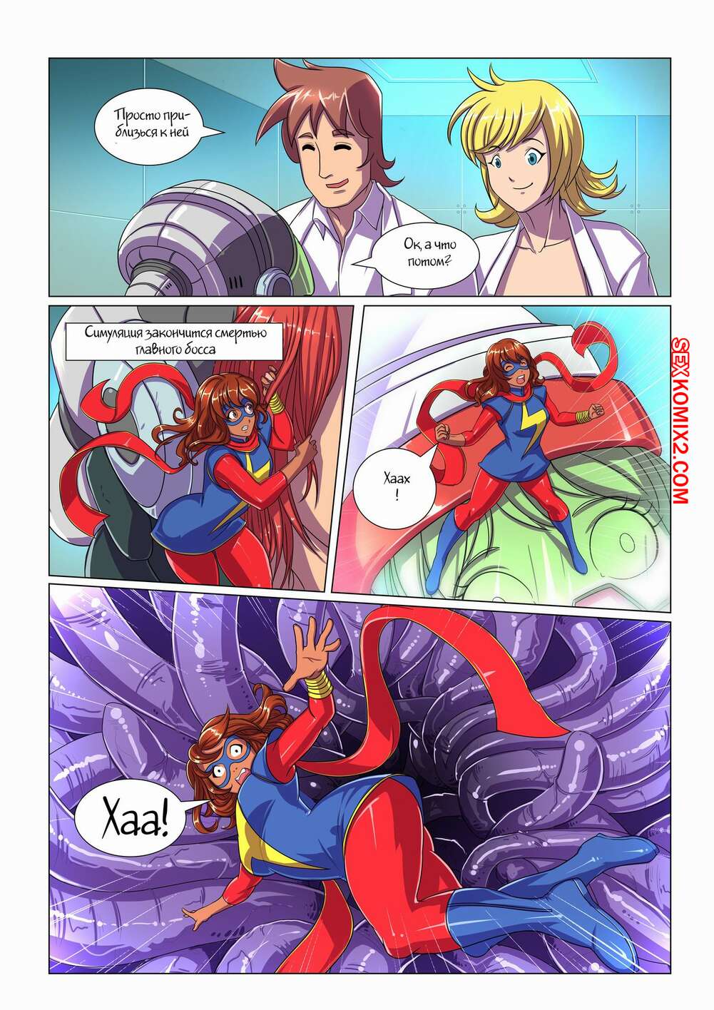 Порно комикс Виртуальный кошмар. Ms Marvel. Virtual Nightmare Горячая сисястая брюнетка супергероиня оказался в виртуальной реальности. Там ее схватил монстр с щупальцами, которые раздел красотку и хорошенько выебал ее во все дырочки.