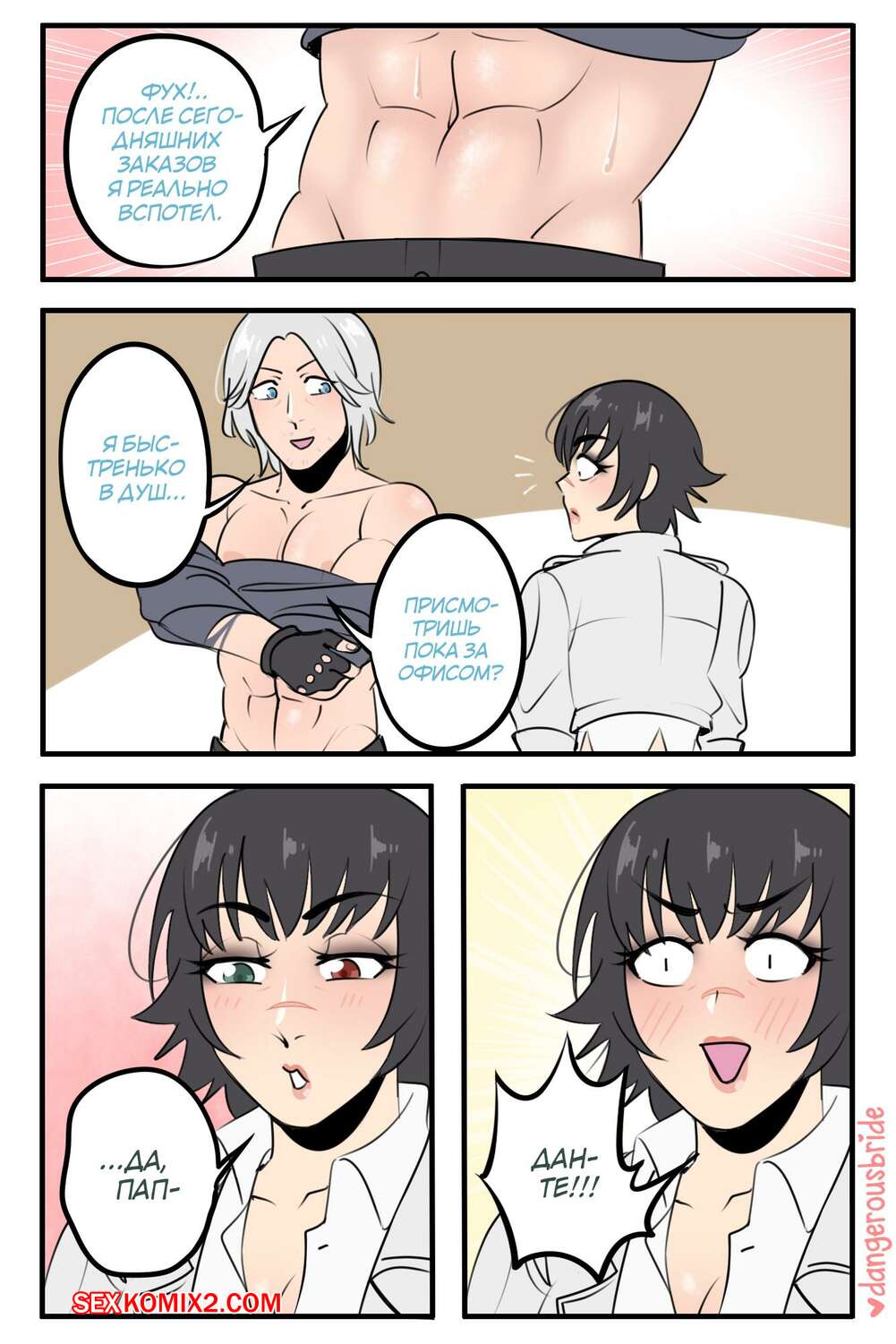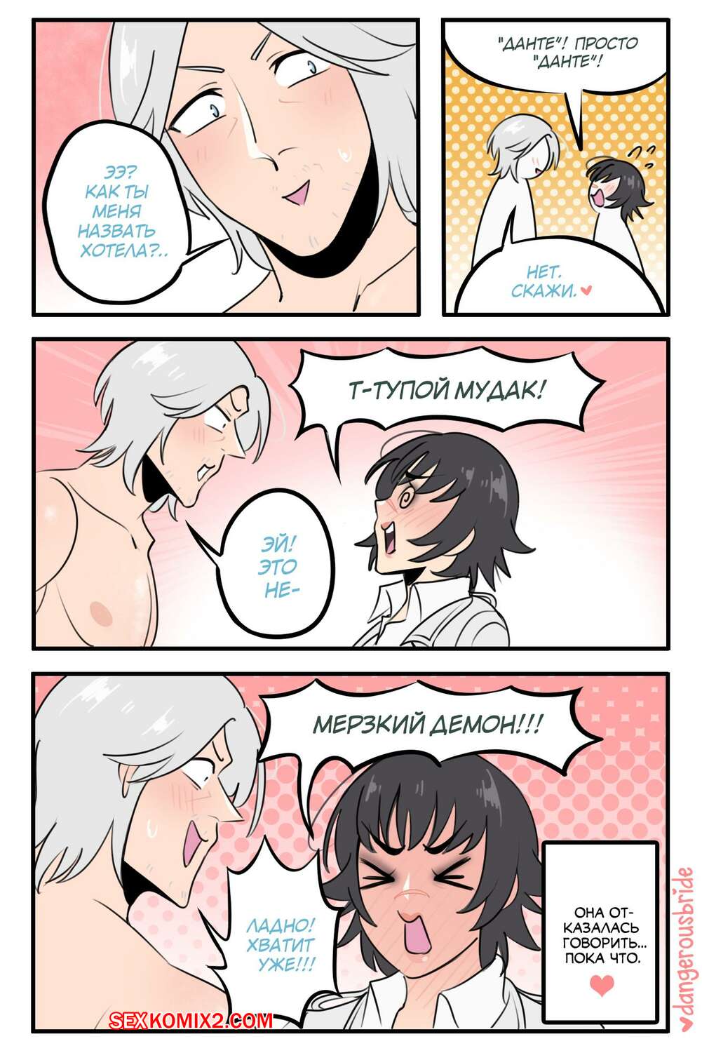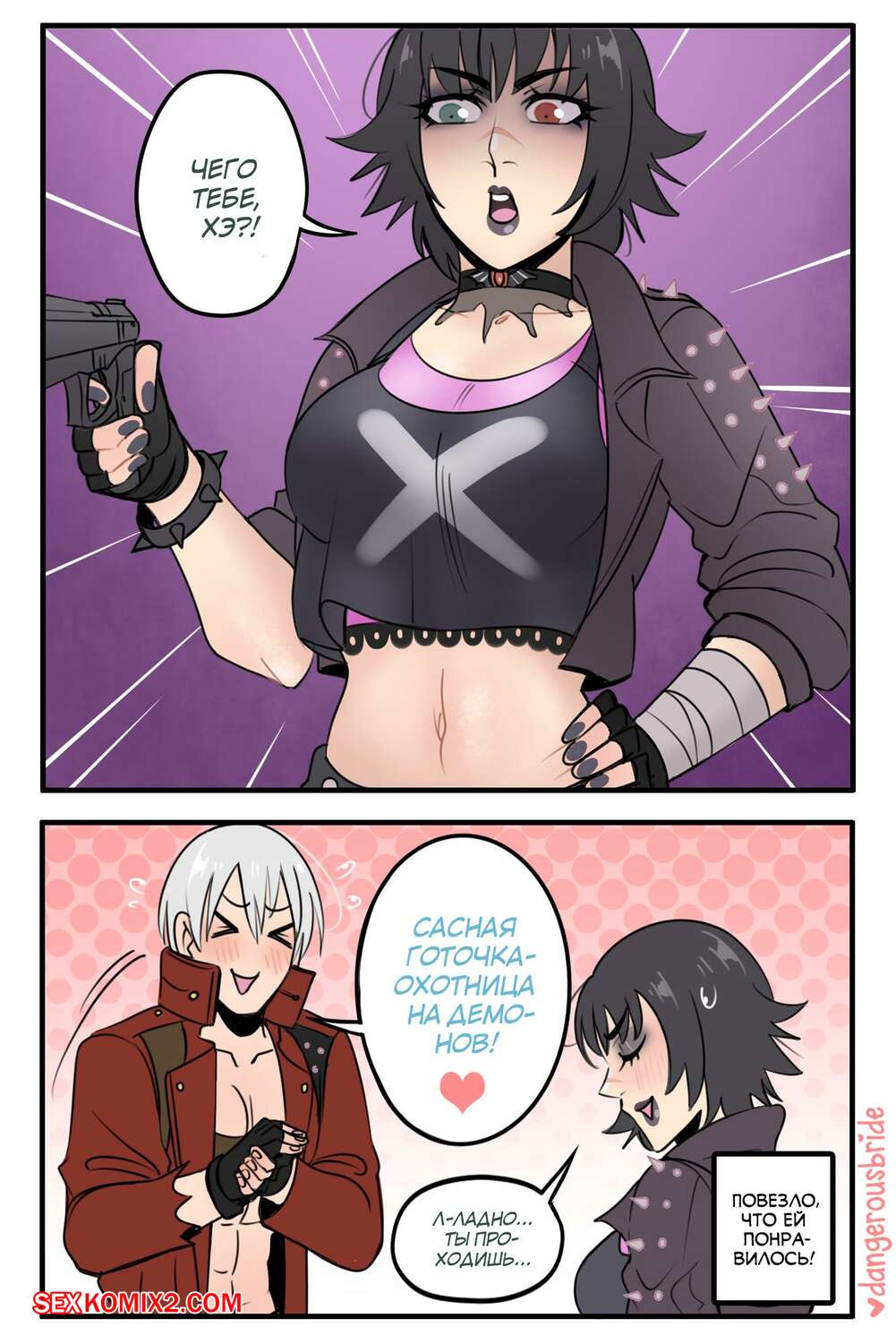 Порно комикс Bleach. Леди х Данте. Dangerous Bride Горячая сисястая брюнетка была очень возбуждена и хотела трахаться. Она разделась перед своим дружком и и дала ему отлизать свою пизденку, после стала сосать его большой хуй и дала ему себя выебать.