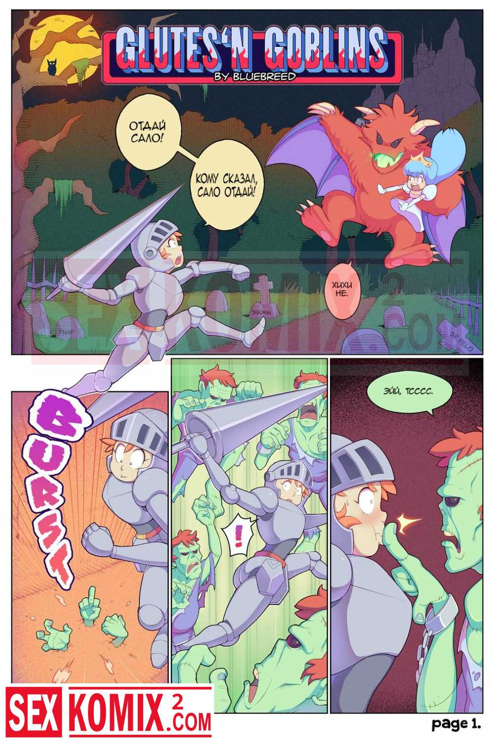 Порно комикс Ягодичный Гоблин. Девушка рыцарь вступила в схватку с армией зомби, чтобы спасти беззащитную принцессу. Но её схватили и выебали во все дыры.