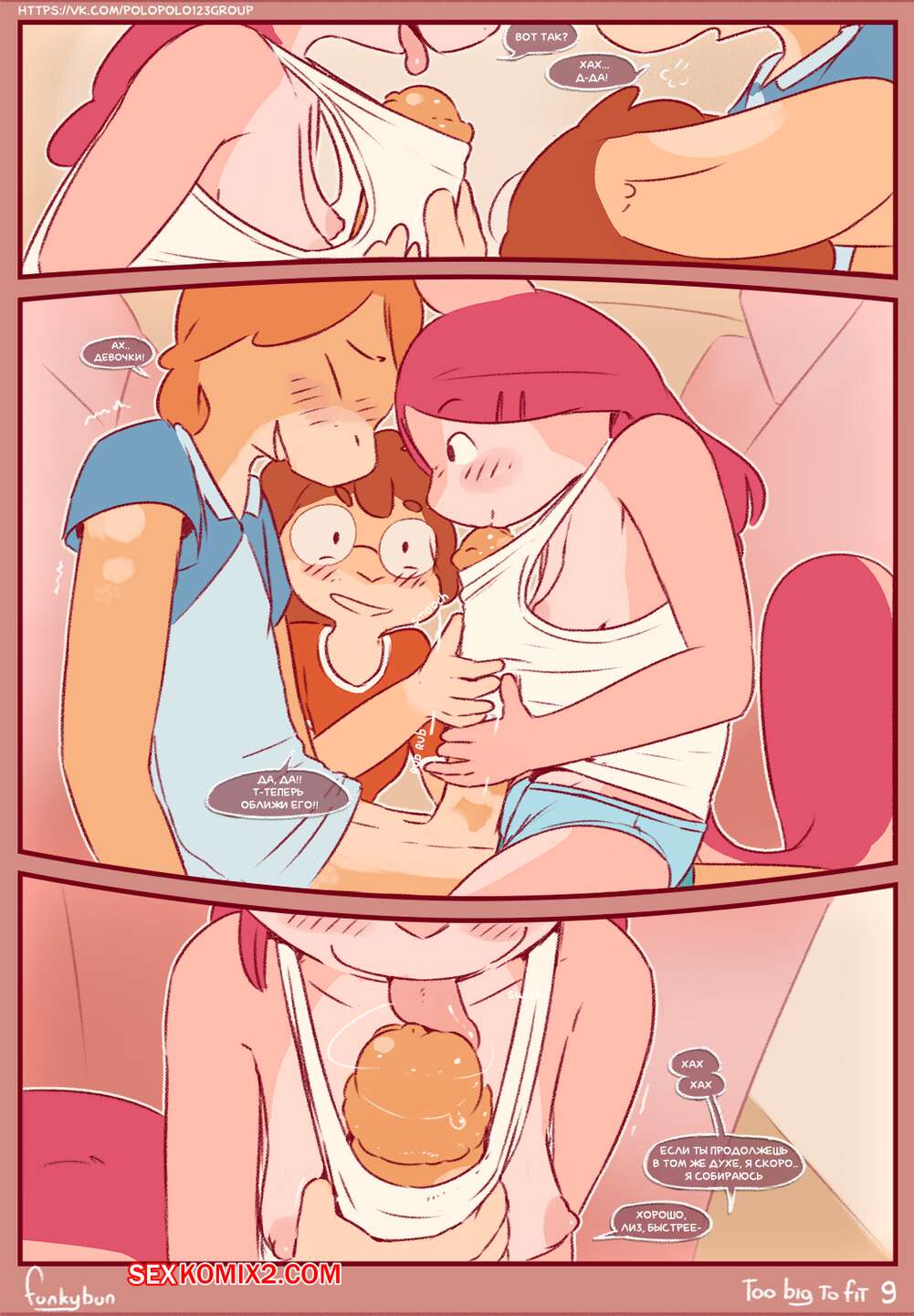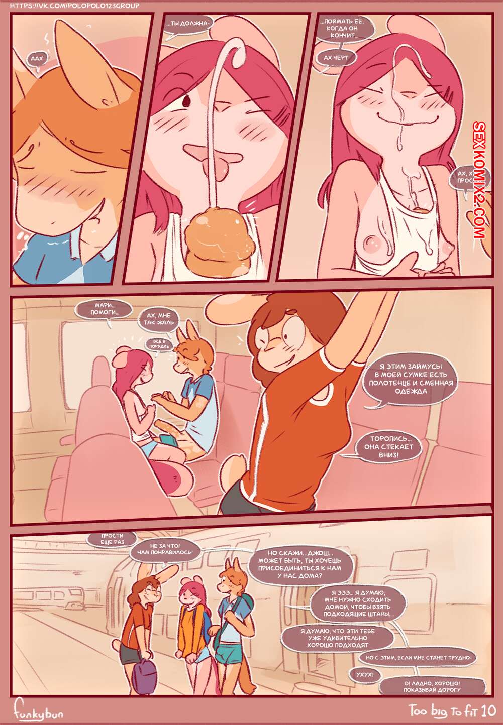 Порно комикс Too Big to Fit. Часть 1. Funkybun Парень ехал в автобусе рядом с сексуальными красотками и у него встал хуй. Девушки возбудилась, поэтому стали ласкать большой хуй парня и дали ему себя выебать.