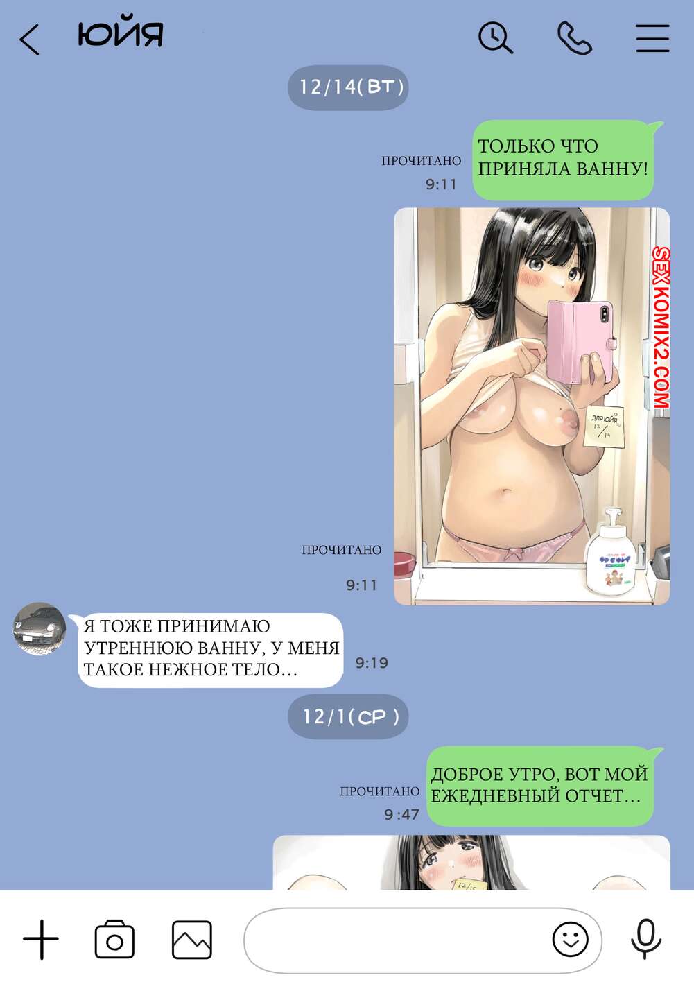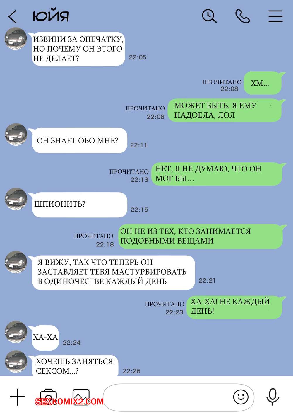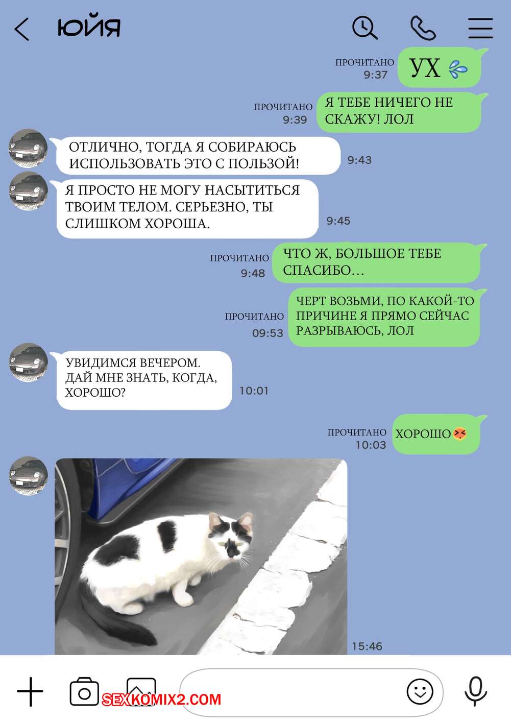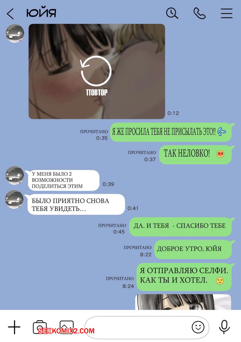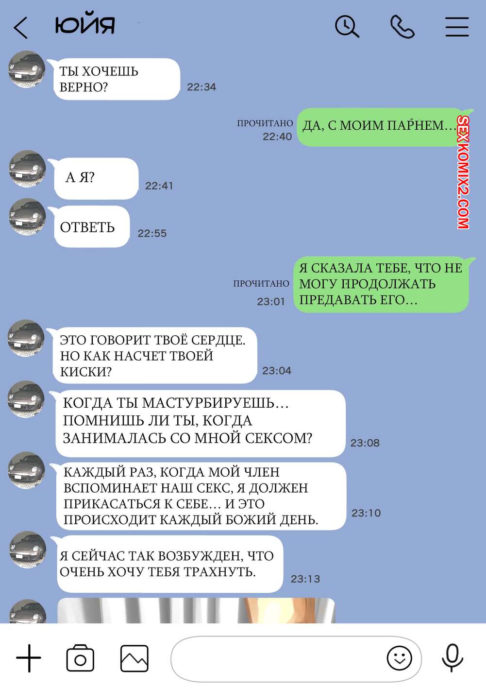 Порно комикс Я только что покопался в её смартфоне. Часть 2 Парень спалил переписку своей девушки с другим парнем и теперь он постоянно изучает ее телефон. Парень видит, как его девушка отправляет свою пизденку другому парню, а также узнал, что она еще и ебется с ним.
