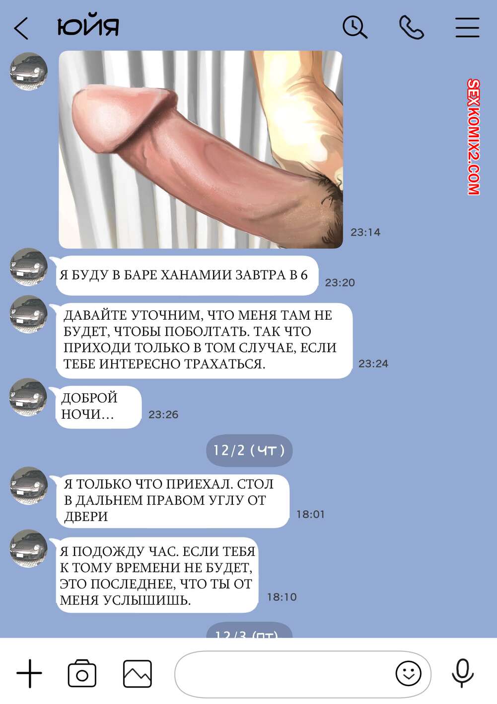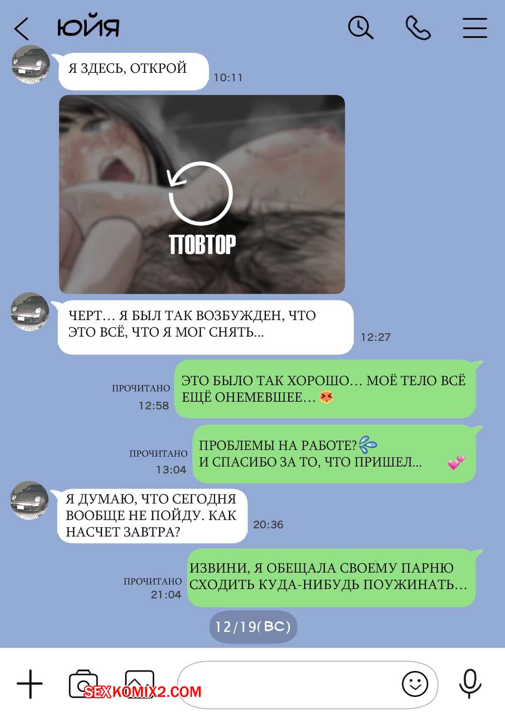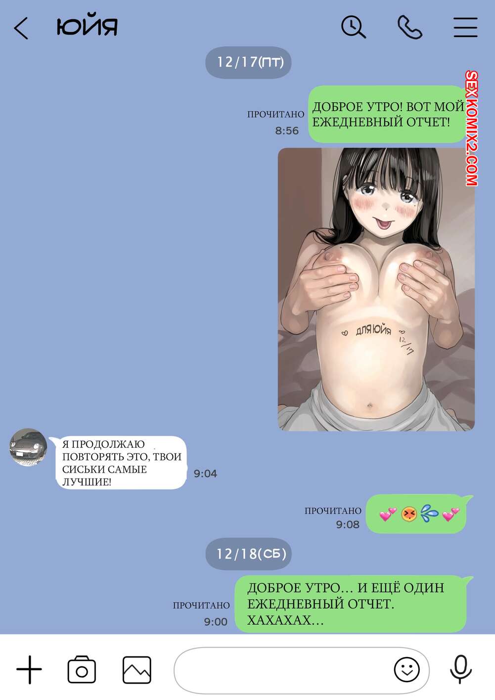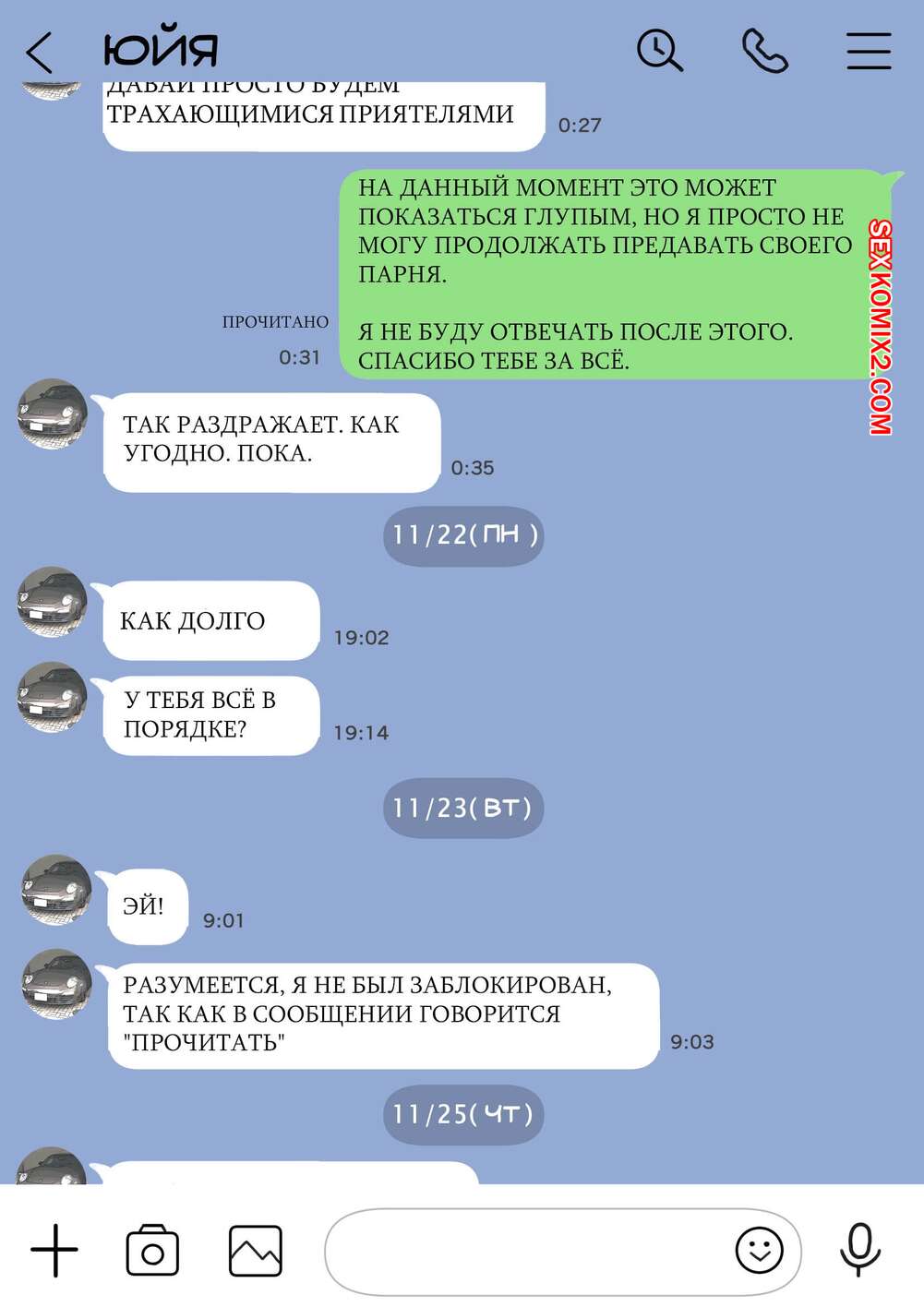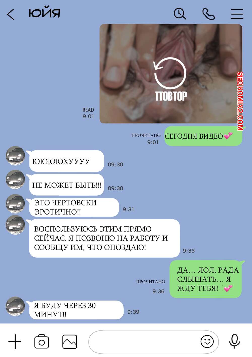 Порно комикс Я только что покопался в её смартфоне. Часть 2 Парень спалил переписку своей девушки с другим парнем и теперь он постоянно изучает ее телефон. Парень видит, как его девушка отправляет свою пизденку другому парню, а также узнал, что она еще и ебется с ним.