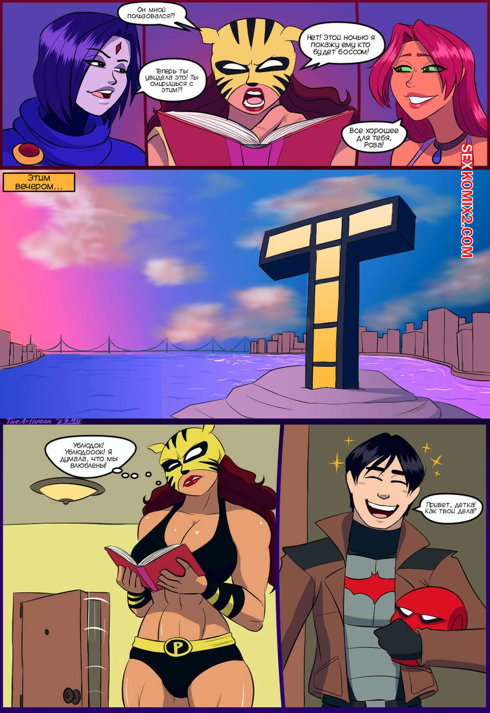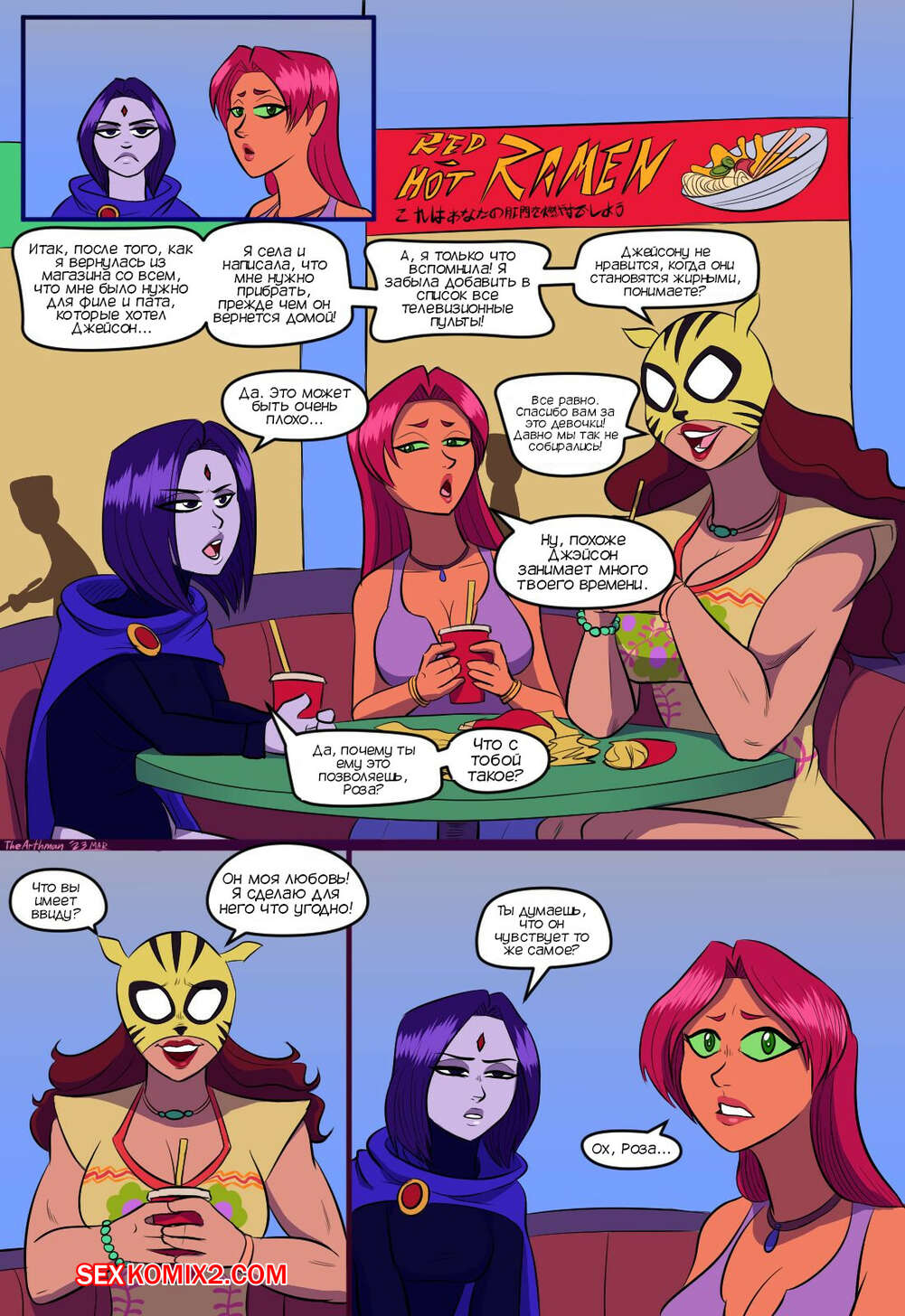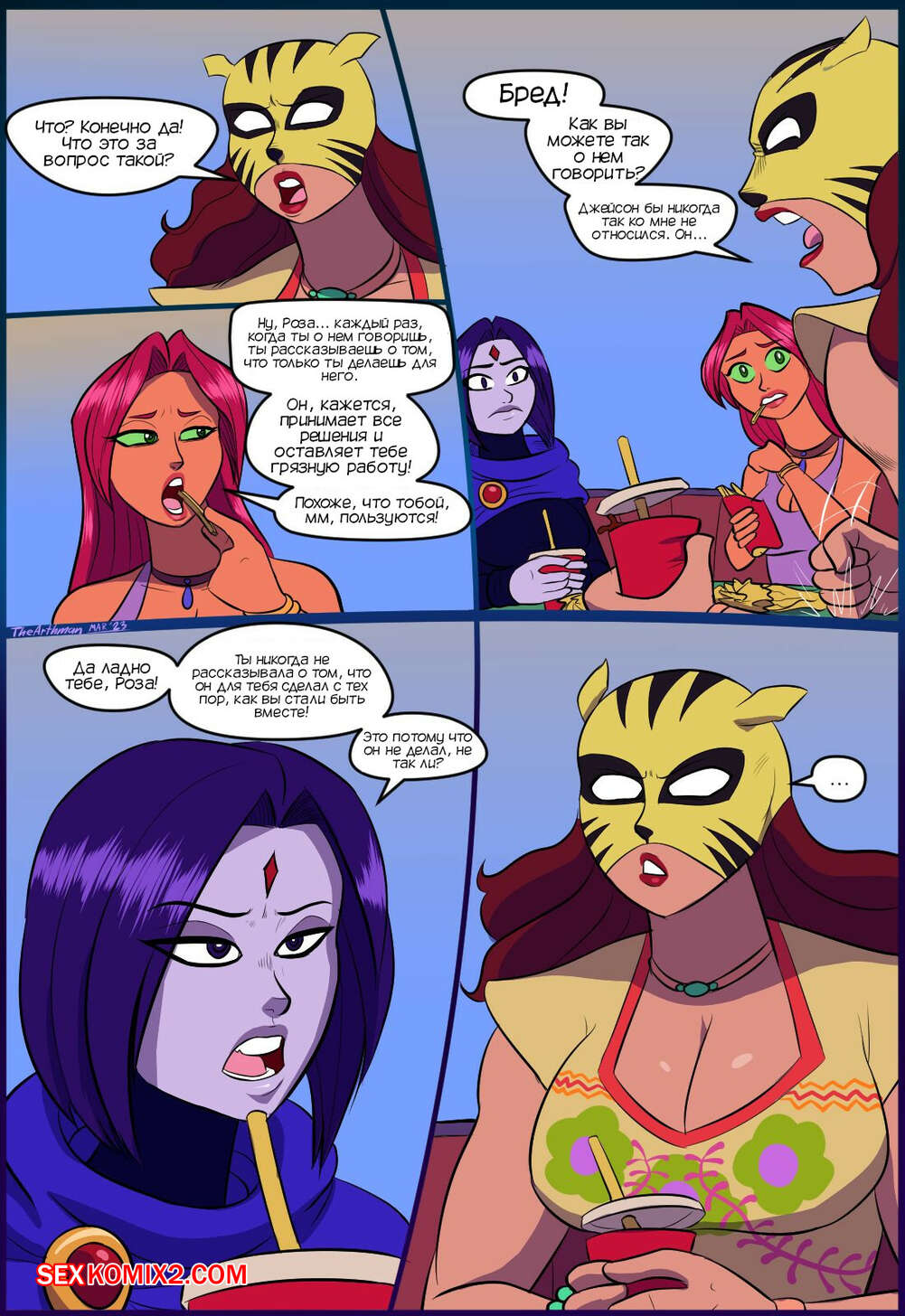 Порно комикс Титаны. Битва полов. The Battle Of The Sexes. The Arthman Три подруги встретились и решили посидеть в кафе. Рейвен и Старфайр решили поднять самооценку Розе, которая все делает для своего парня, а в ответ не получает ничего..