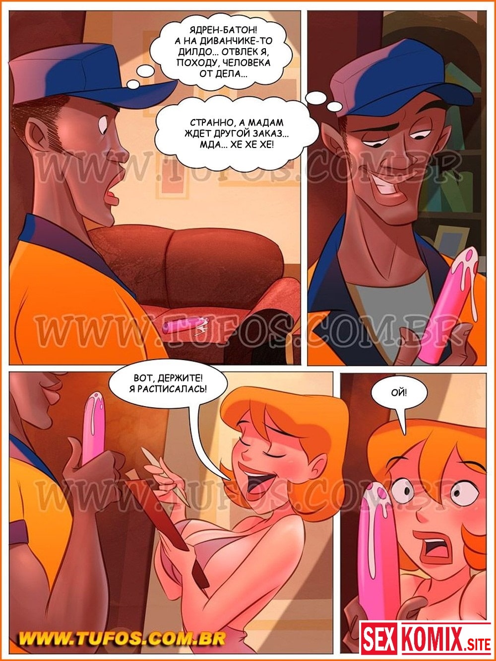 Порно комикс На Олимпиаде. Женщине очень хочется трахаться, но ей остается только смотреть Олимпиаду по телевизору, где показывают чернокожего бегуна. Все же похотливое берет вверх и она достает своё дидло, которым она хочет удовлетворить себя, но в самый разгар мастурбации в дверь позвонили! Кто же это может быть? Это чернокожий курьер, как раз тогда когда он нужен, женщина его соблазняет и они трахаются на пороге.