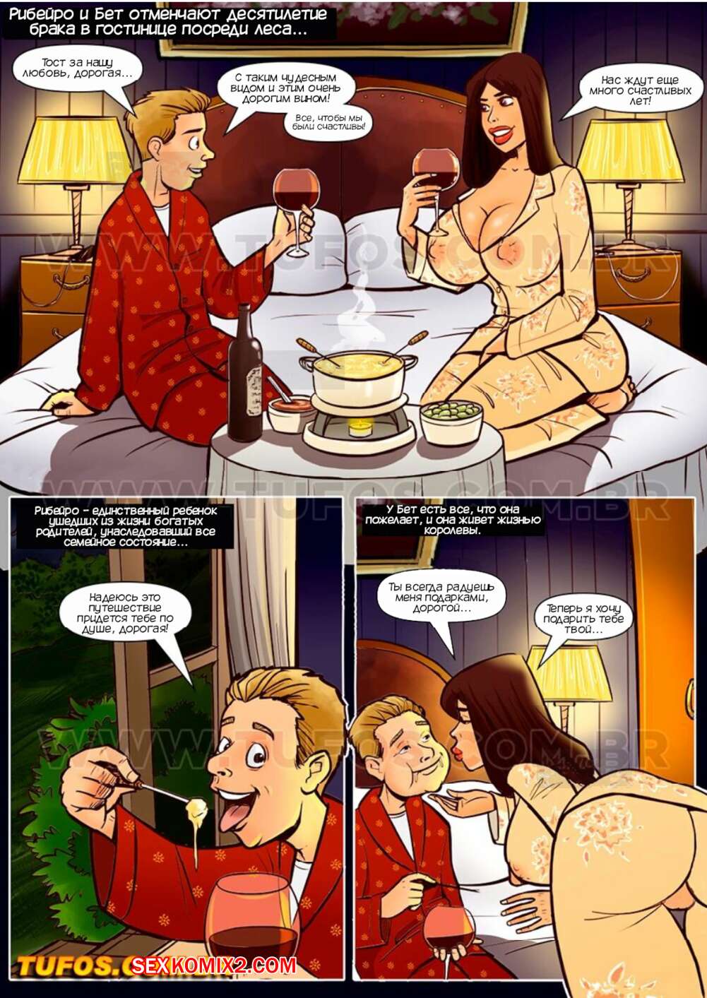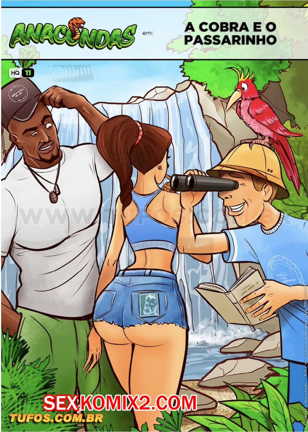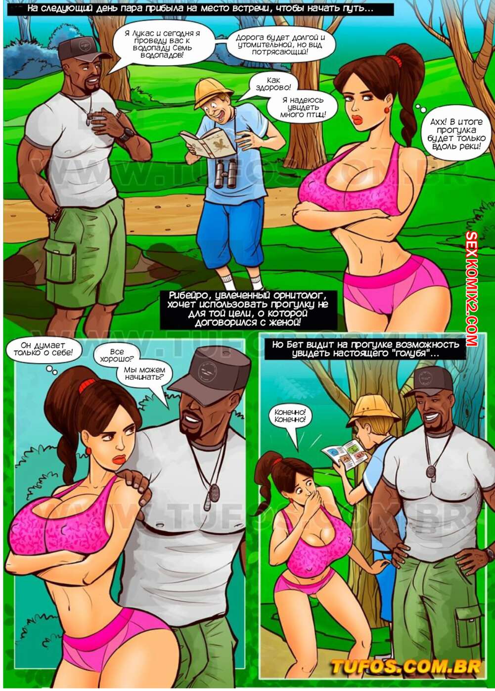 Порно комикс Анаконды. Часть 11. Змей и птенчик. Anacondas. Tufos Мужик с женой отправились на прогулку по лесу, где их сопровождал темнокожий гид. Он отправил мужчину в лес, а сам раздел его жену и хорошенько выебал ее во все дырочки.