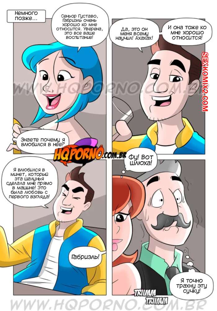 Порно комикс Извращенцы. Часть 12. Встреча с невесткой. Os pervertidos. Hqporno Густаво остался наедине с девушкой своего сына и они решили повеселиться. Красотка стала сосать большой хуй мужчины, после чего он ее хорошенько выебал, получив огромное удовольствие.