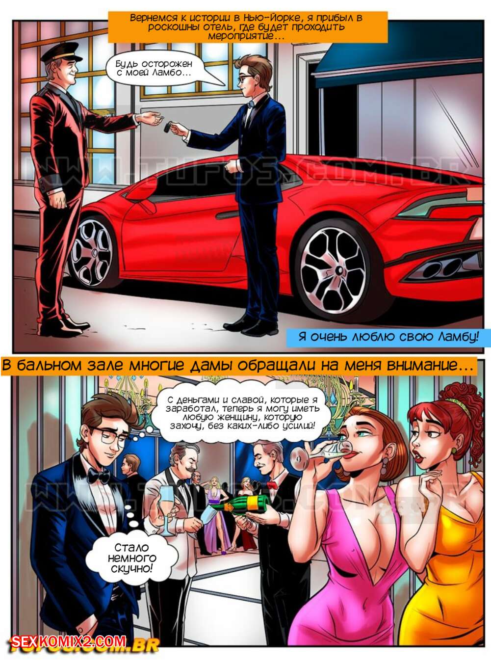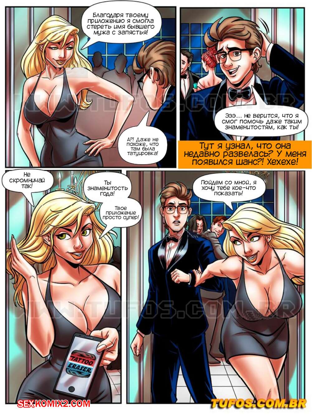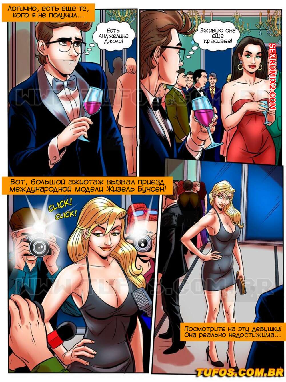 Порно комикс Лакомство заучки. Часть 43. В мире знаменитостей. O nerd comedor. Tufos Мартин разбогател и стал знаменитым. Его пригласили на торжество, где он познакомился с сексуальной супер моделью. Красотка пригласила парня к себе в номер, где он ее хорошенько выебал и кончил в ротик.