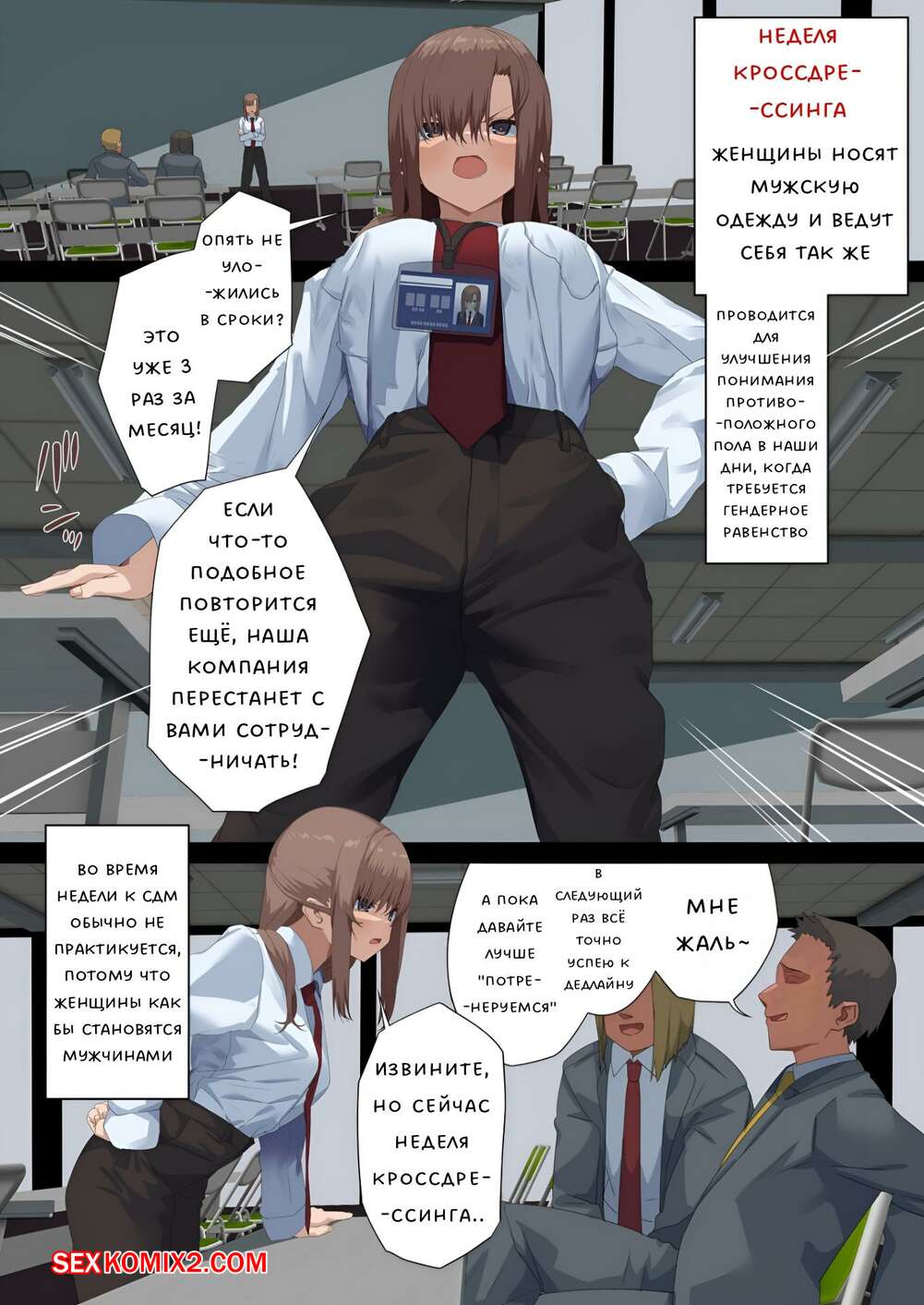 Порно комикс Манеры делового секса. Неделя К. Illumination Сексуальная брюнетка была очень возбуждена на работе в офисе и решила повеселиться со своими коллегами. Девушка разделась и отсосала большие хуи парней, после чего дала им себя выебать.