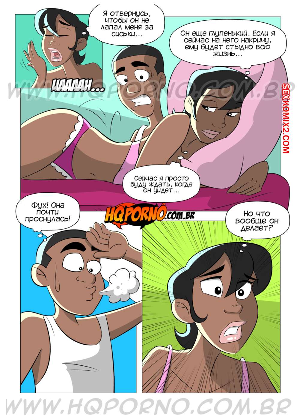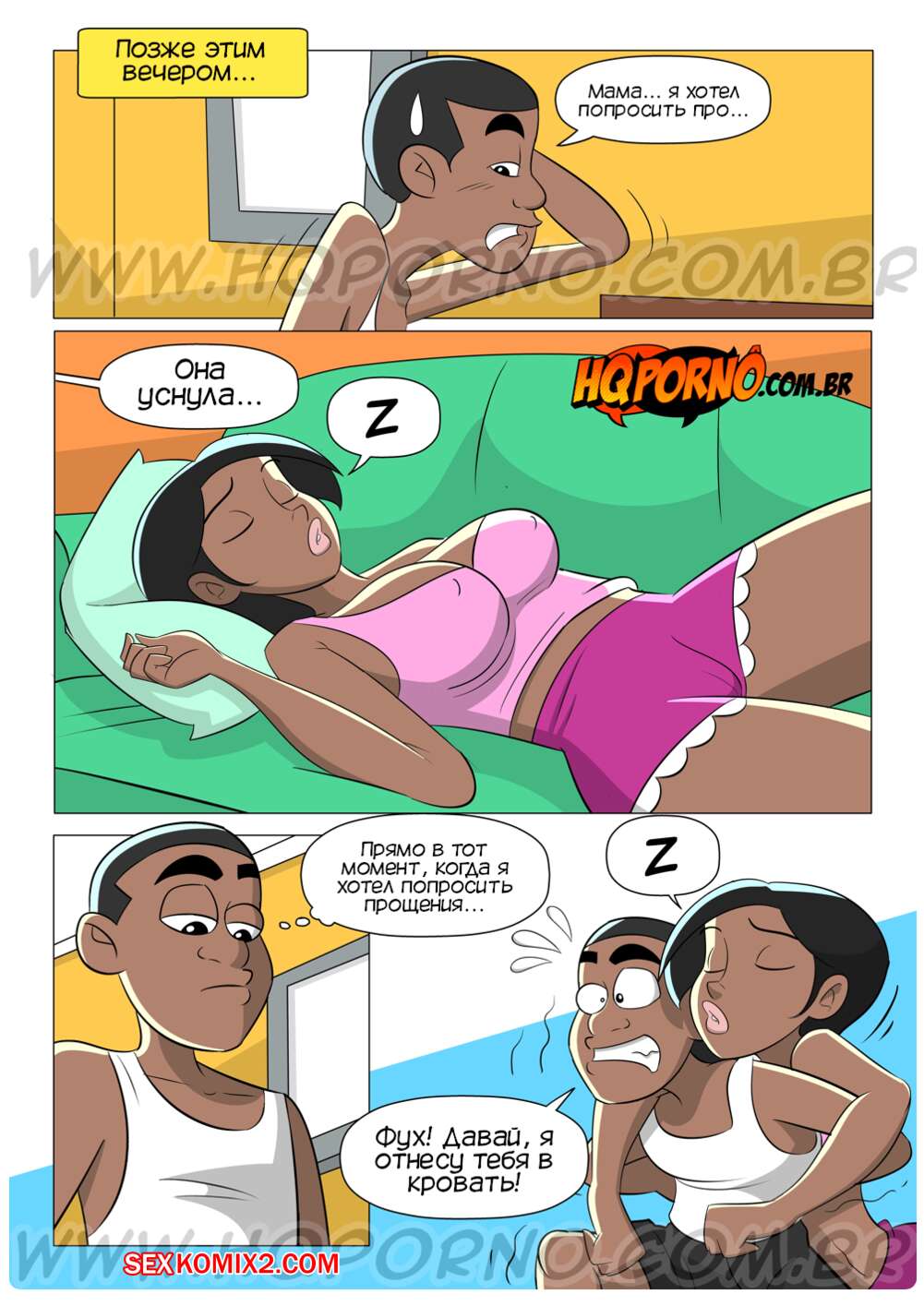 Порно комикс Семейка черных. Часть 4. Немного подарить маме. Familia Black. HQporno Темнокожий парень возбудился при виде шикарного тела своей мамки. Он долждался, когда она уснет, после чего пробрался к ней в комнату и хорошенько выебал мамку, кончив в нее.