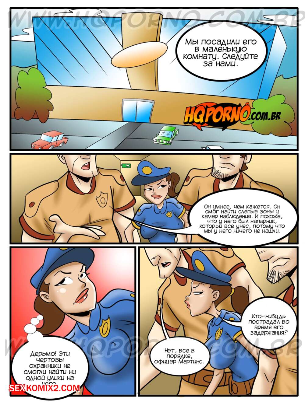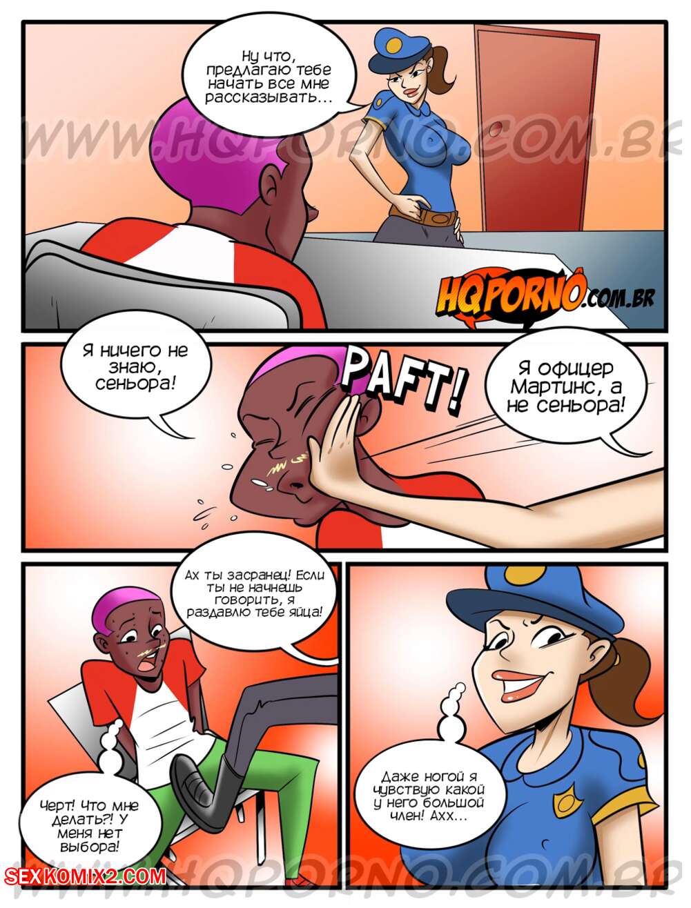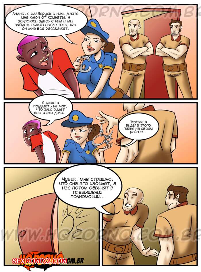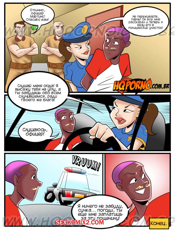 Порно комикс Грехи соседства. Часть 8. Подчиняйся гребаной полиции. Pecados da vizinhanca. HQporno Горячая красотка полицейская проводил допрос темнокожего парня. Она заметила огромный хуй парня и решила с ним повеселиться. Красотка разделась и отсосала его большой хуй, после чего дала ему себя выебать.