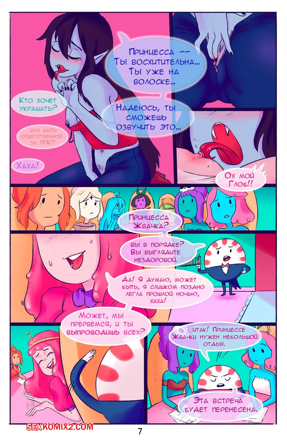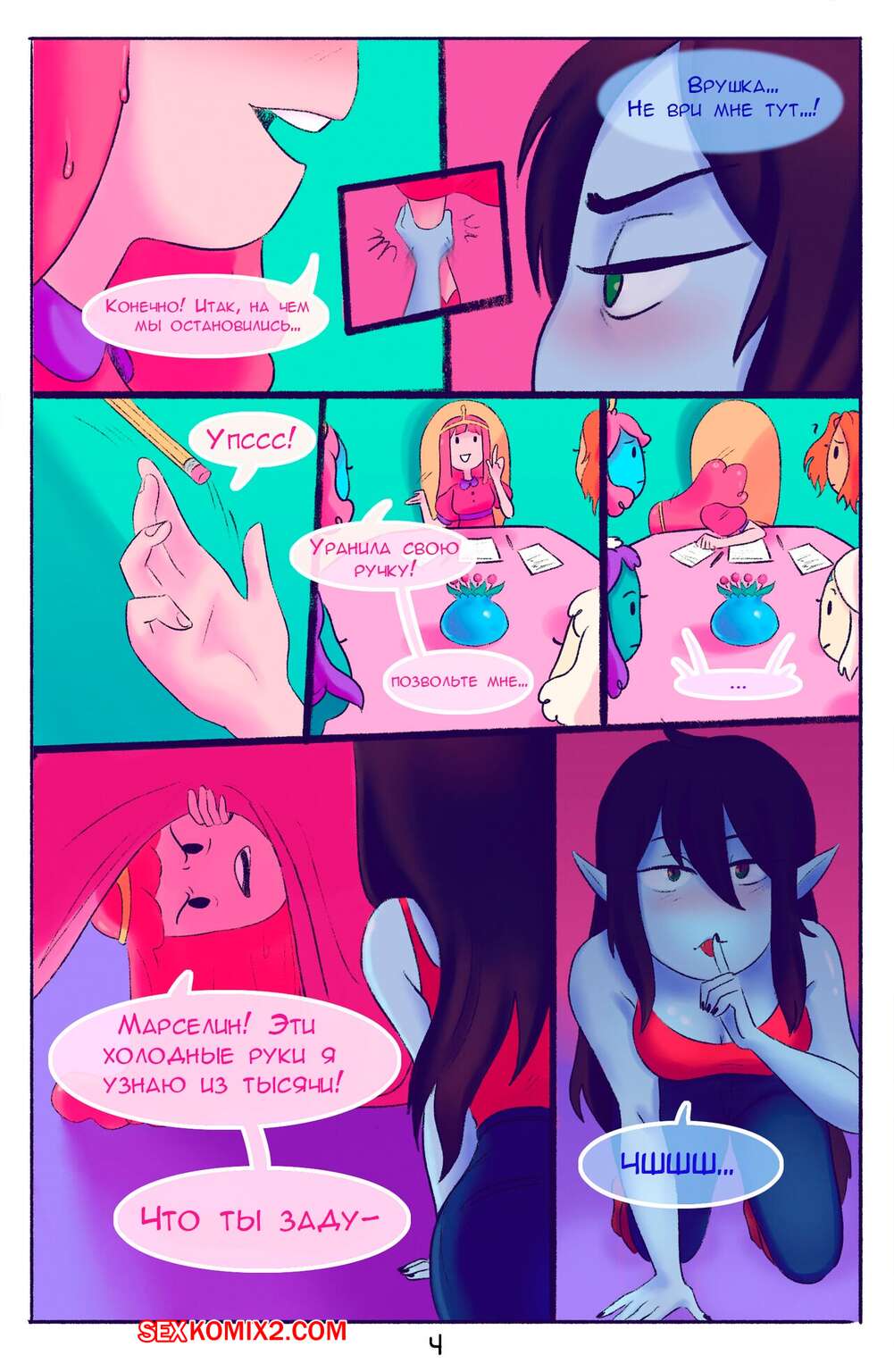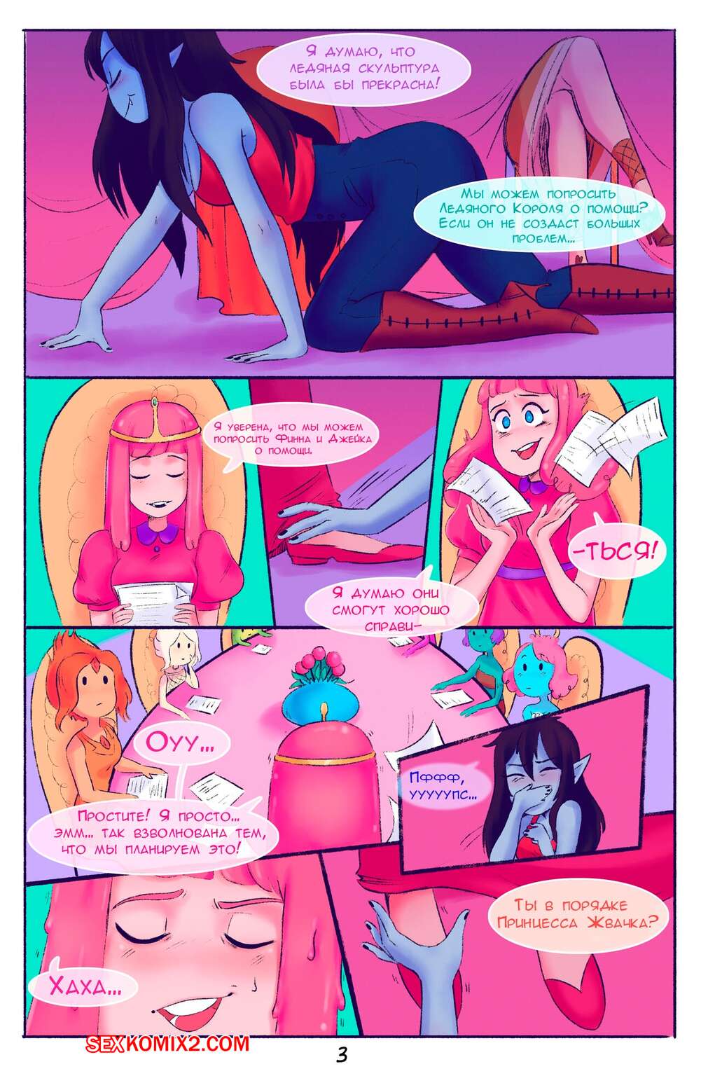 Порно комикс Adventure Time. Краткое прерывание. Squid Горячая брюнетка была очень возбуждена и решила повеселиться со своей подругой. Она отправилась к ней домой и залезла под стол к девушке, после чего отлизала ее пизденку, получив огромное удовольствие.