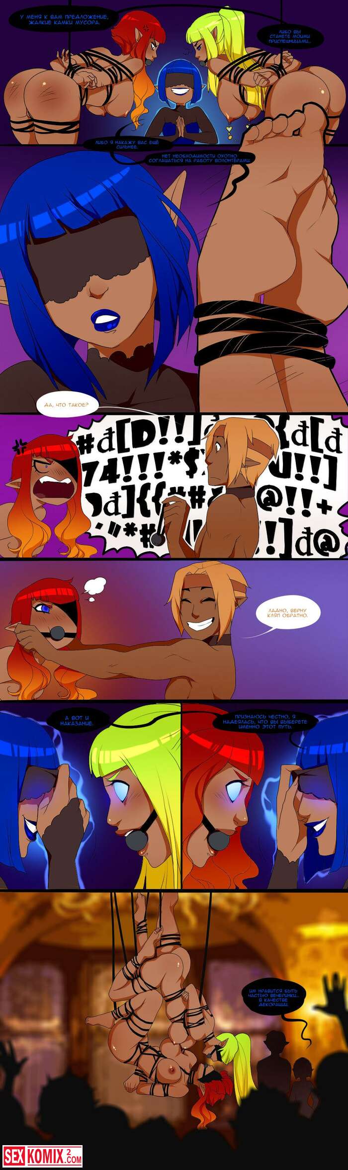 Порно комикс Королева попок. Часть 7. Развратная волшебница связала своих подруг и завязали им глаза, она внушила им желание трахаться.