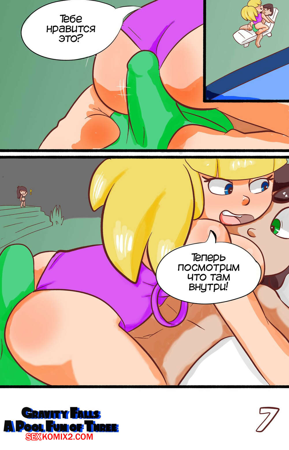 Порно комикс Gravity Falls. Тройное веселье у бассейна. A Pool Fun of Three Диппер и Пасифика остались наедине у бассейна и парень возбудился, увидев голую сиську девушки. Красотка заметила стояк парня и решила повеселиться, начав сосать член парня.
