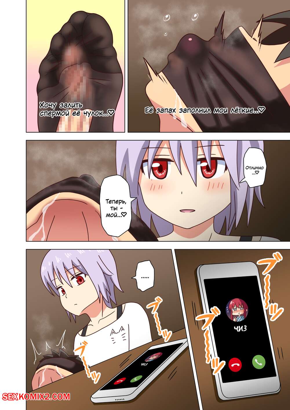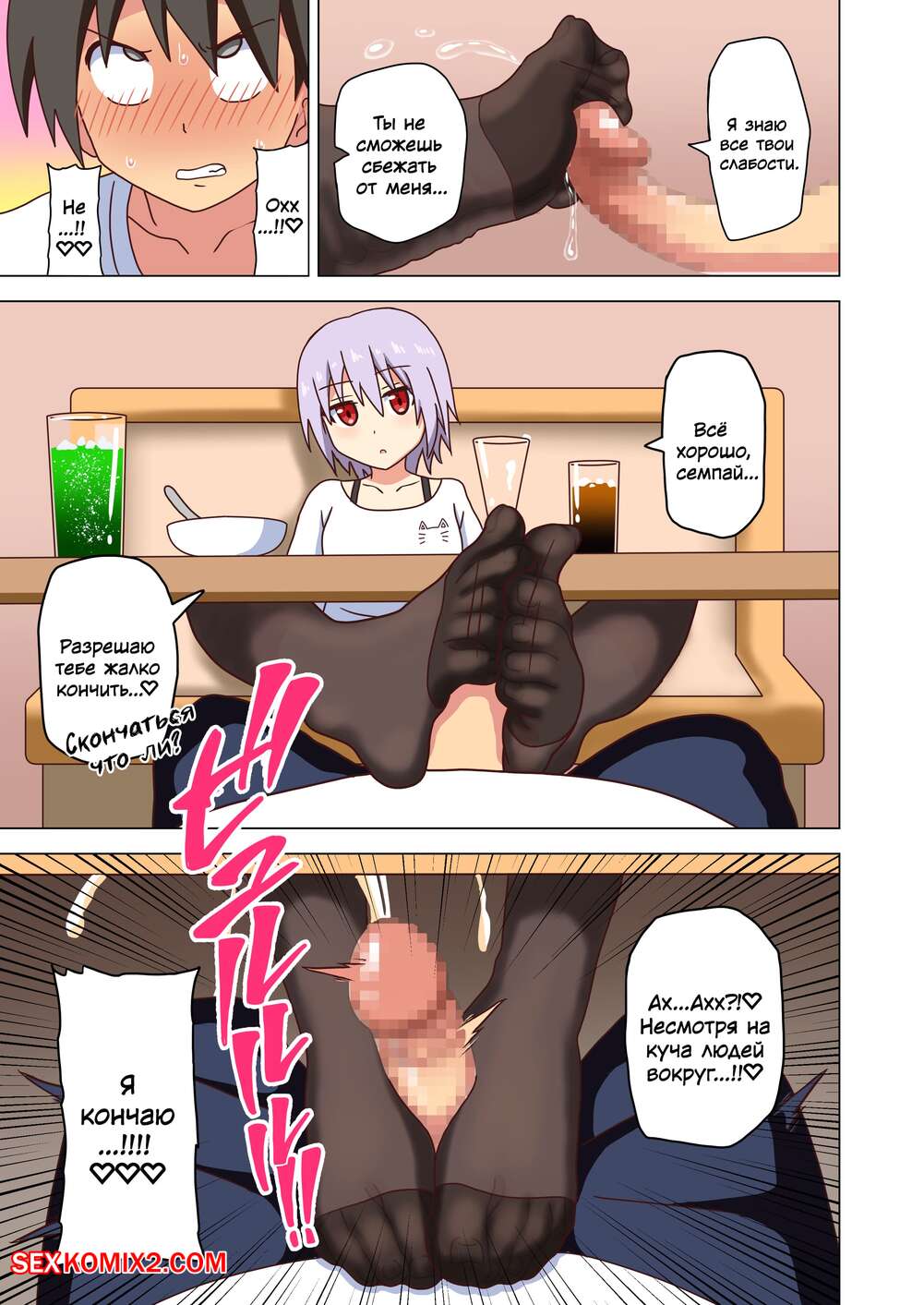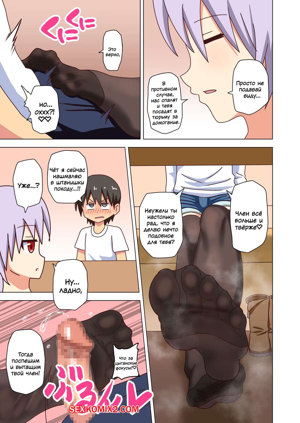 Порно комикс История футфетишиста. Часть 24. Nush Сексуальная блондинка была очень возбуждена и решила повеселиться со своим дружком. Она достала хуй парня и стала дрочить его своими ножками, помогая парню кончить.
