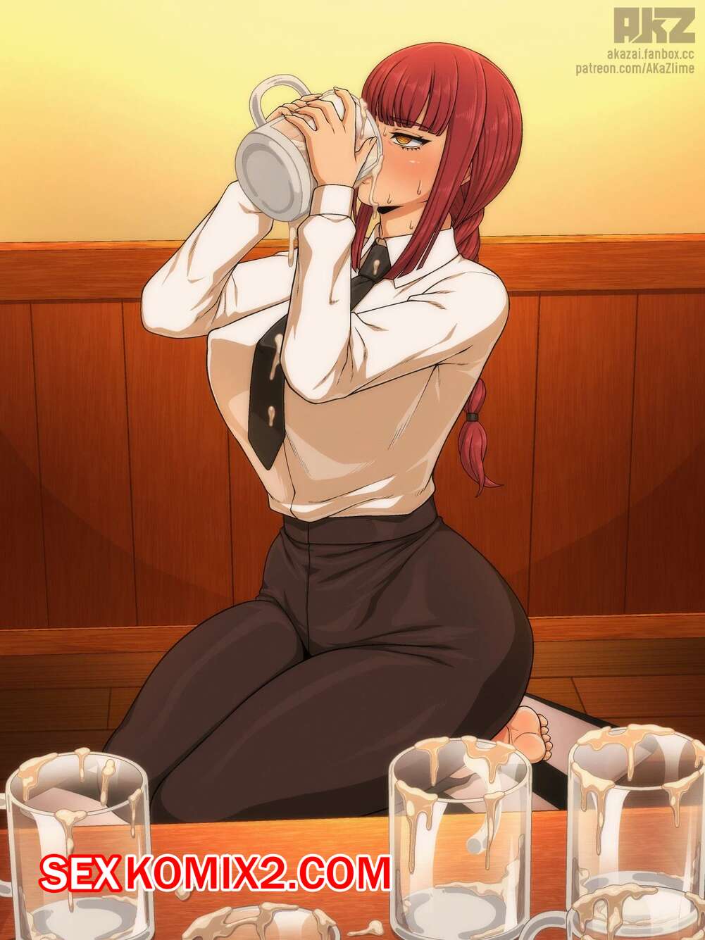 Порно комикс Бензопила. Chainsawman. AKaZlime Сексуальная брюнетка была очень возбуждена и решила повеселиться со своим дружком. Она связала его и надела на него ошейник, после чего дала ему себя хорошенько выебать.