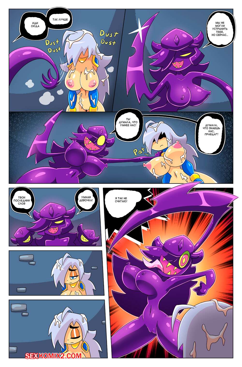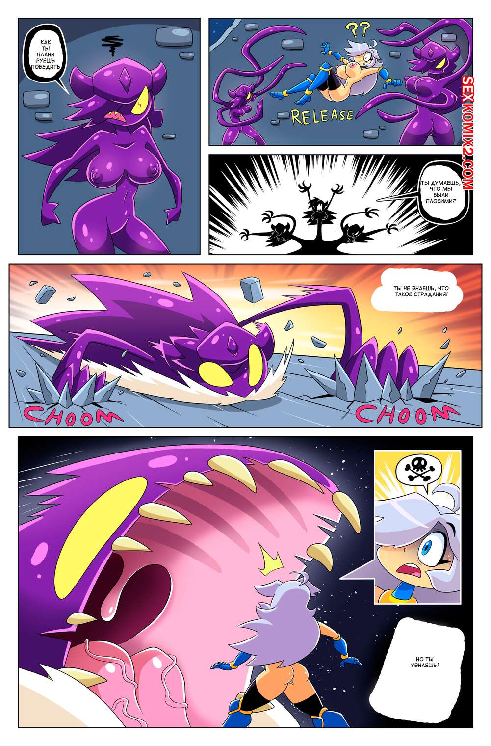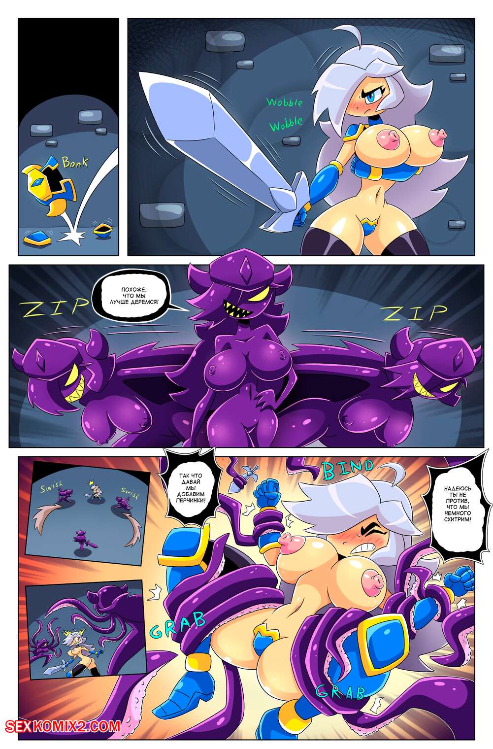 Порно комикс Сисястый квест. Часть 4. Booby Quest. DrShanks24 На горячую блондинку воительницу напал монстр. Он сперва выебал пизденку девушки и заполнил ее своей спермой, после чего проглотил ее и трахнул дырочки девушки в своем желудке.