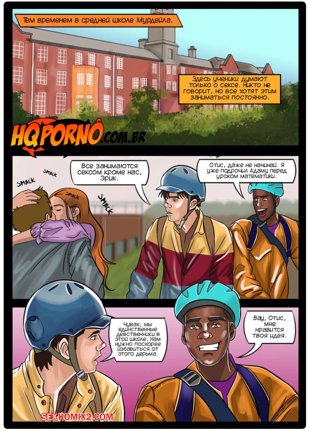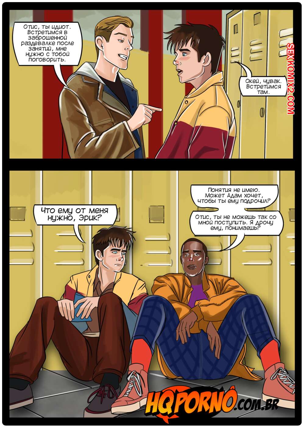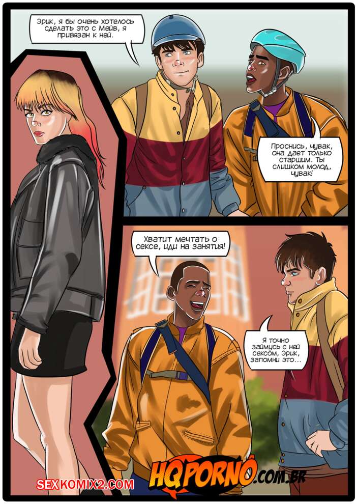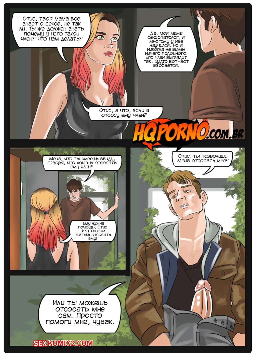 Порно комикс Половое воспитание. Часть 1. Sexo na escola. HQPorno Адам пригласил Отиса после уроков в заброшенную раздевалку. Мейв пошла с другом и они обнаружили Адама с огромным стояком. Мейв решила помочь ему расслабиться, поэтому встала на колени и стала ему отсасывать.
