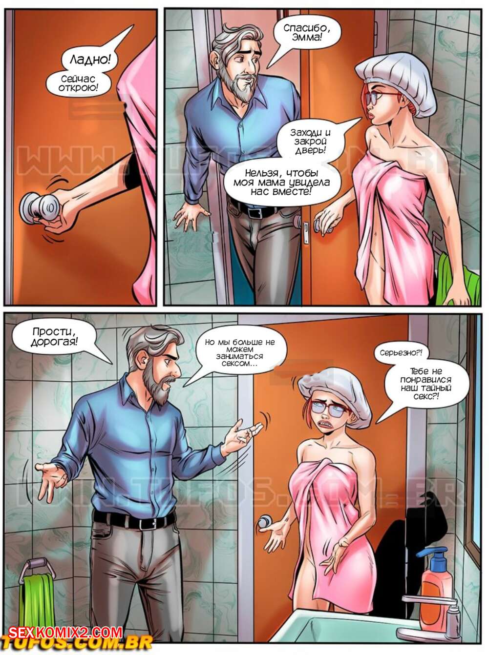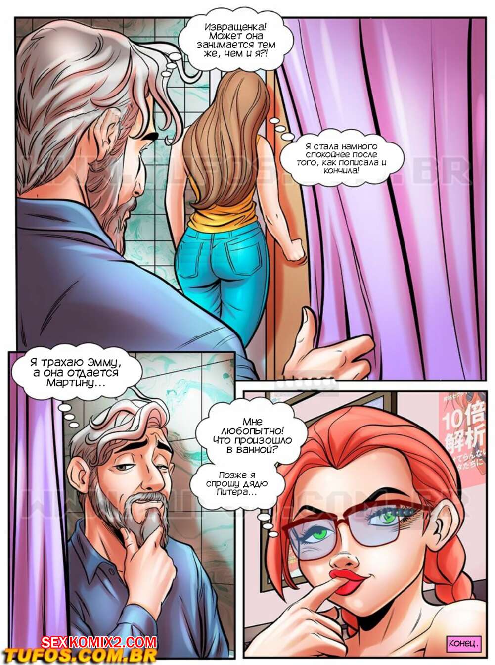 Порно комикс Нимфоманка ботаник. Часть 11. A Nerd Ninfomanca. Tufos Дядя Питер пошел в ванную к Эмме и не смог устоять перед шикарным телом девушки. Она раздвинула ножки и попросила его трахнуть ее пизденку, но им помешала мама девушки..