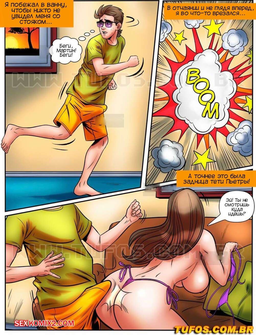 Порно комикс Лакомство заучки. Часть 48. Назад в прошлое. O nerd comedor. Tufos Мартин обдумывал свою жизнь и то, как он стал успешным. Парень вспомнил момент, как он впервые увидел задницу своей тети во всей красе. Милфа заметила стояк парня и стала ему дрочить, после чего отсосала его хуй и дала ему кончить себе на задницу.