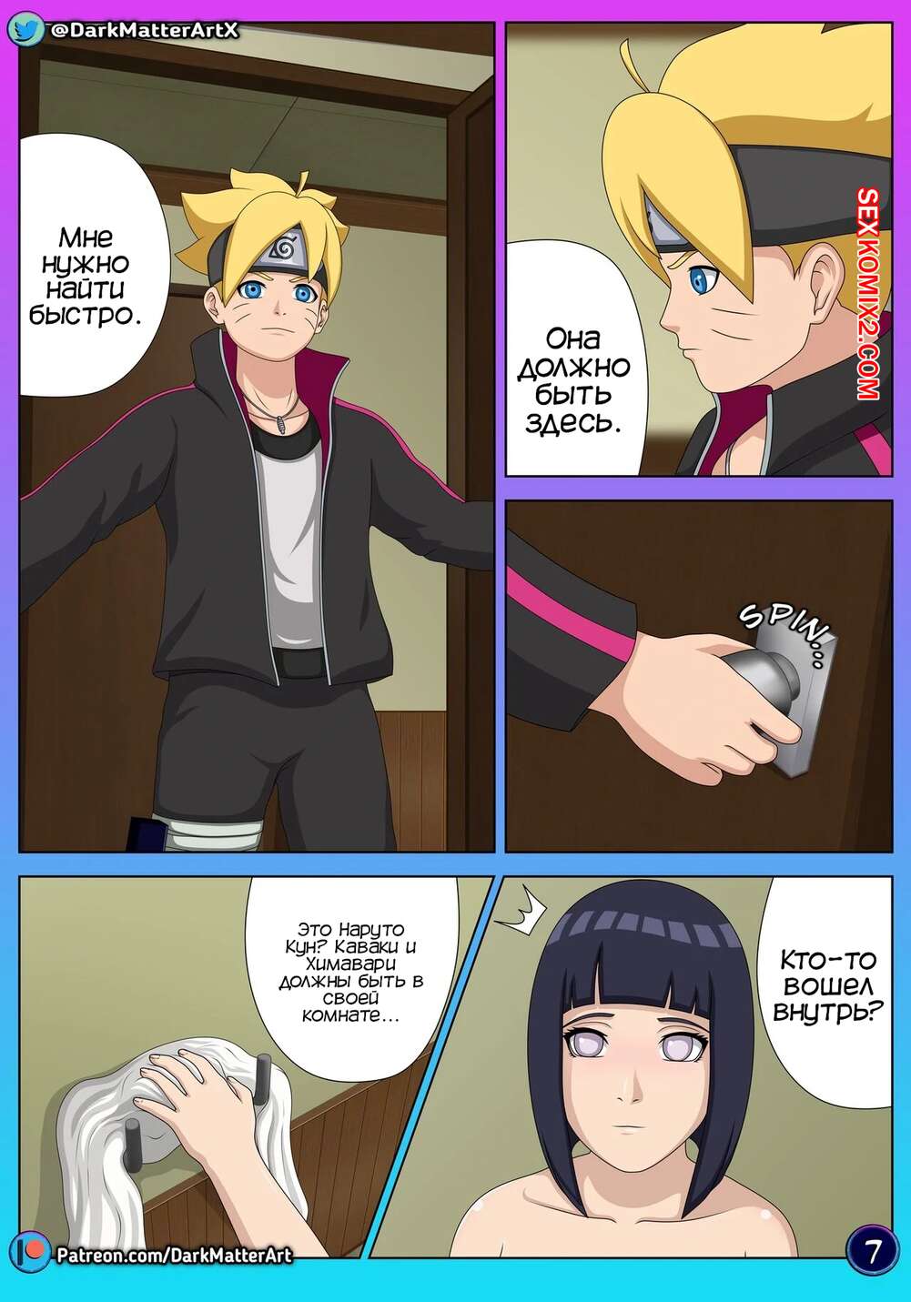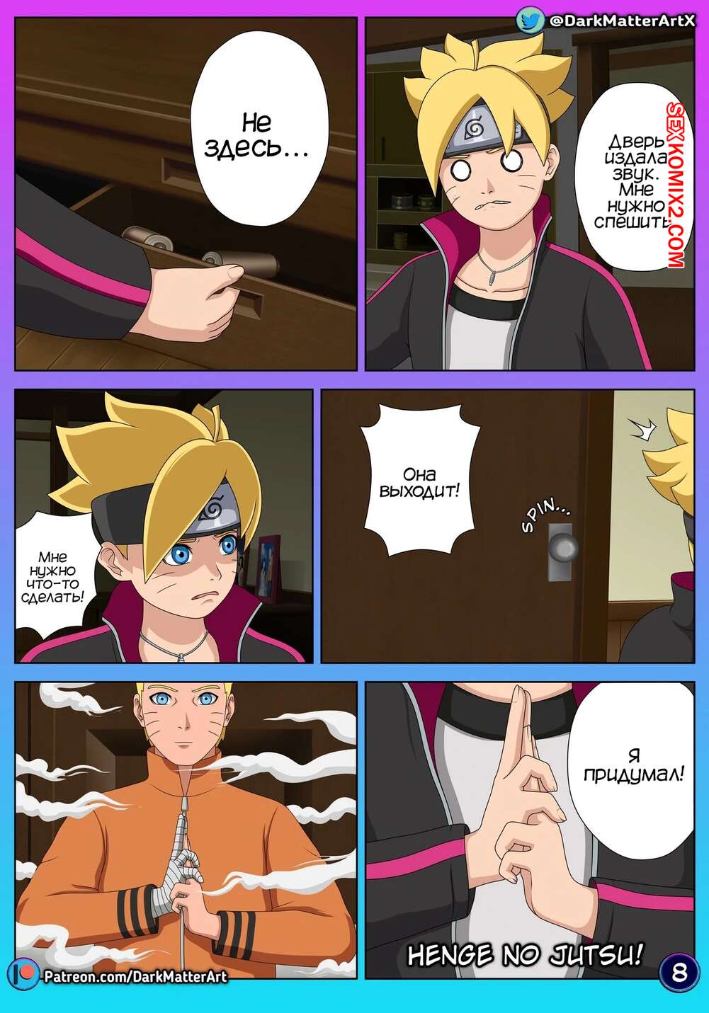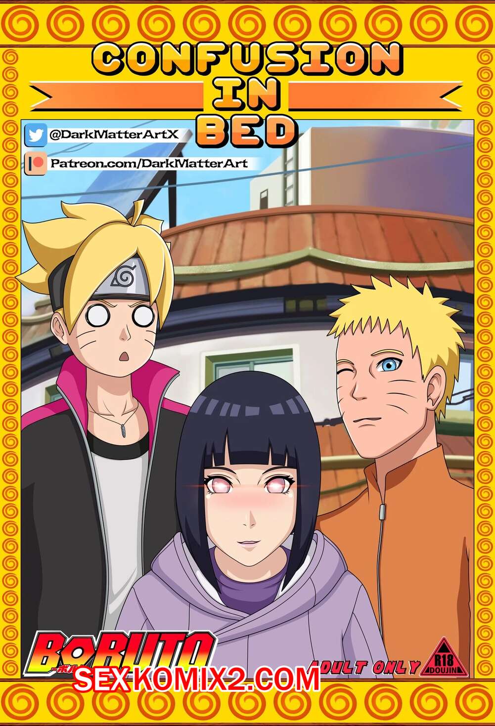 Порно комикс Наруто. Путаница в постели. Confusion in Bed. Darkmatter Боруто проник в душ к своей маме в поисках защитника. Он испугался, что она его спалит, поэтому быстро превратился в своего отца. Хината была возбуждена и решила повеселиться с Наруто, поэтому отсосала его член и дала ему себя выебать.