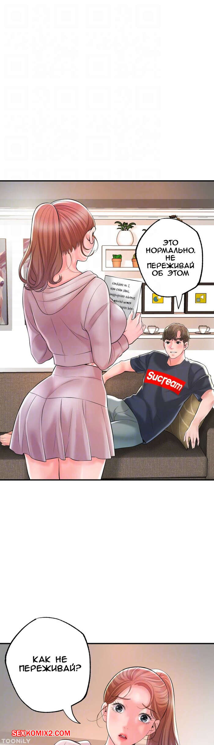 Порно комикс Новый город. Часть 89. New town Девушка решила серьезно поговорить с парнем, но он стал переводить тему. Он потянул девушку к себе и усадил ее на колени, после чего снял с нее халатик и стал ласкать красотку.