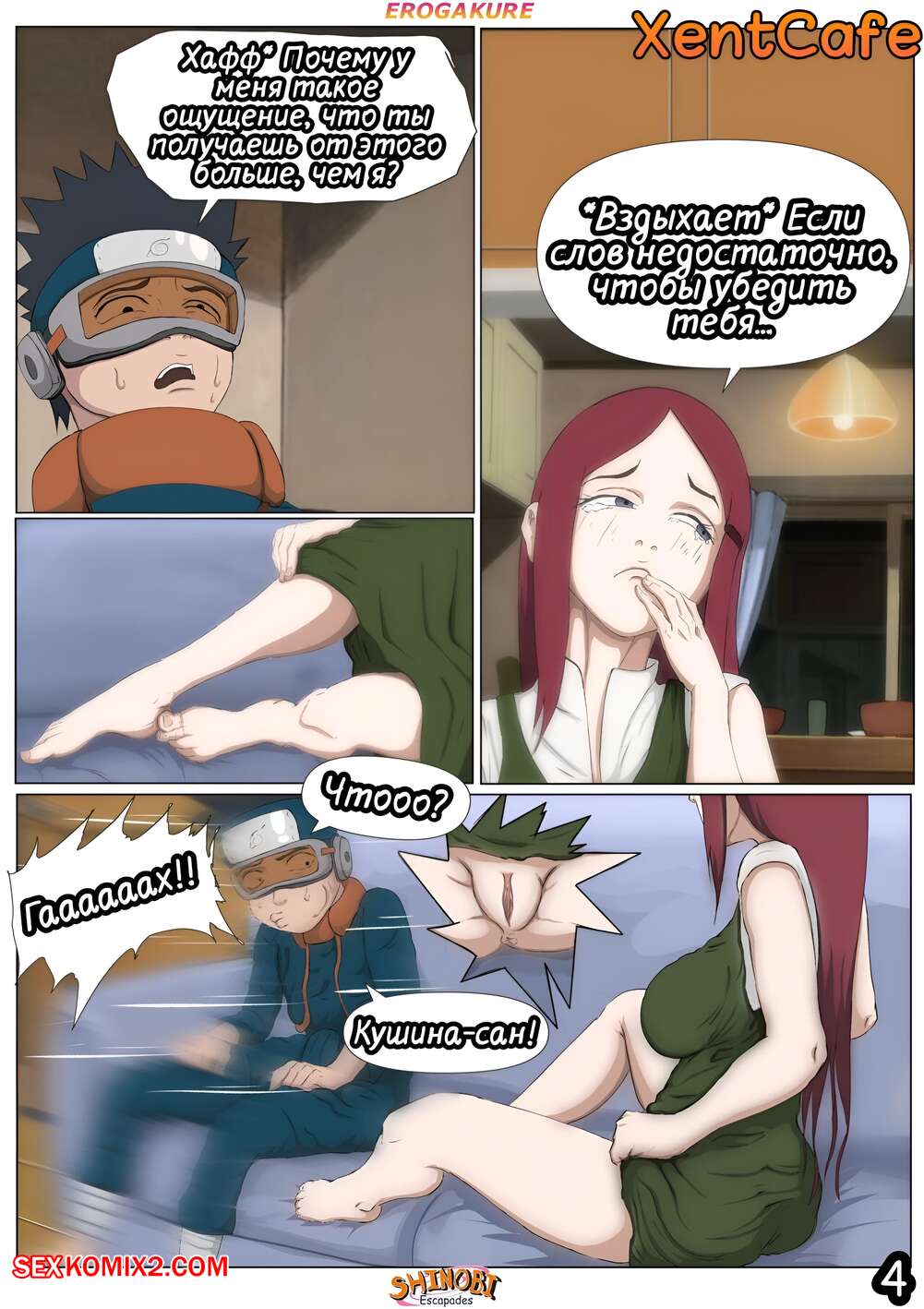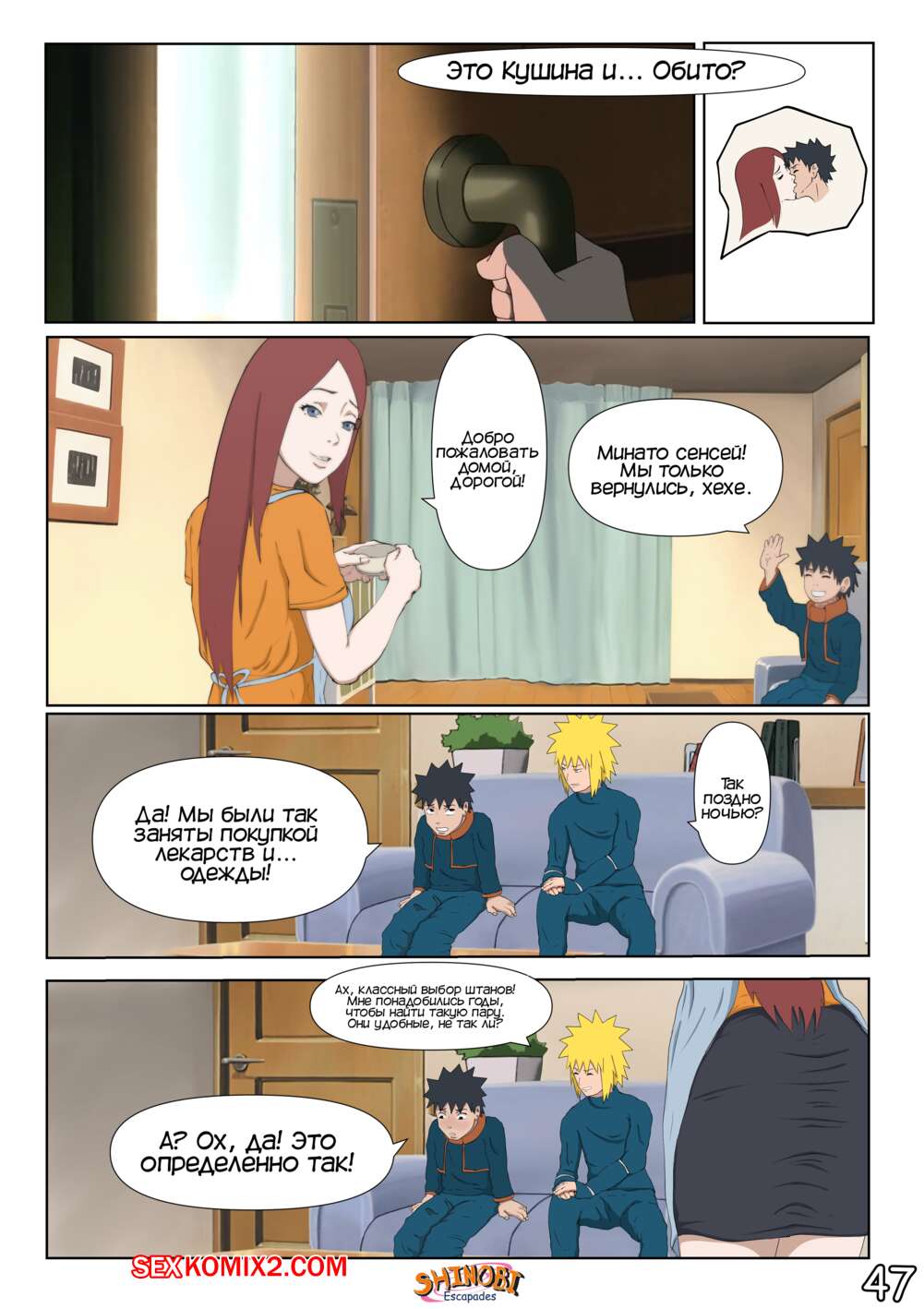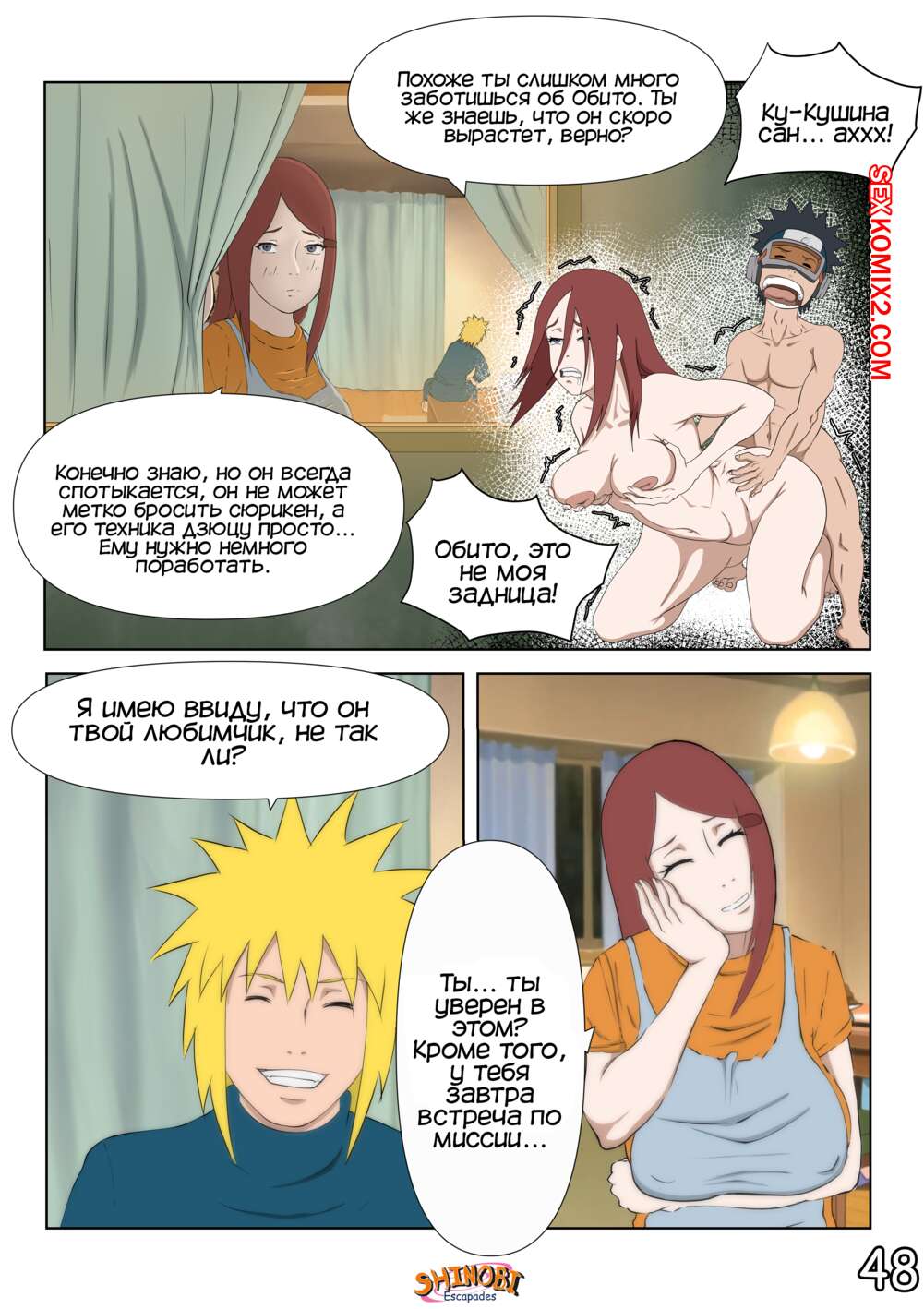 Порно комикс Наруто. Эскапады Шиноби. Часть 2 Обито пришел домой к Кушине и горячая милфа решила повеселиться с парнем. Она стала соблазнять и возбуждать парня, демонстрируя ему свое шикарное тело, желая ощутить большой хуй парня в себе.