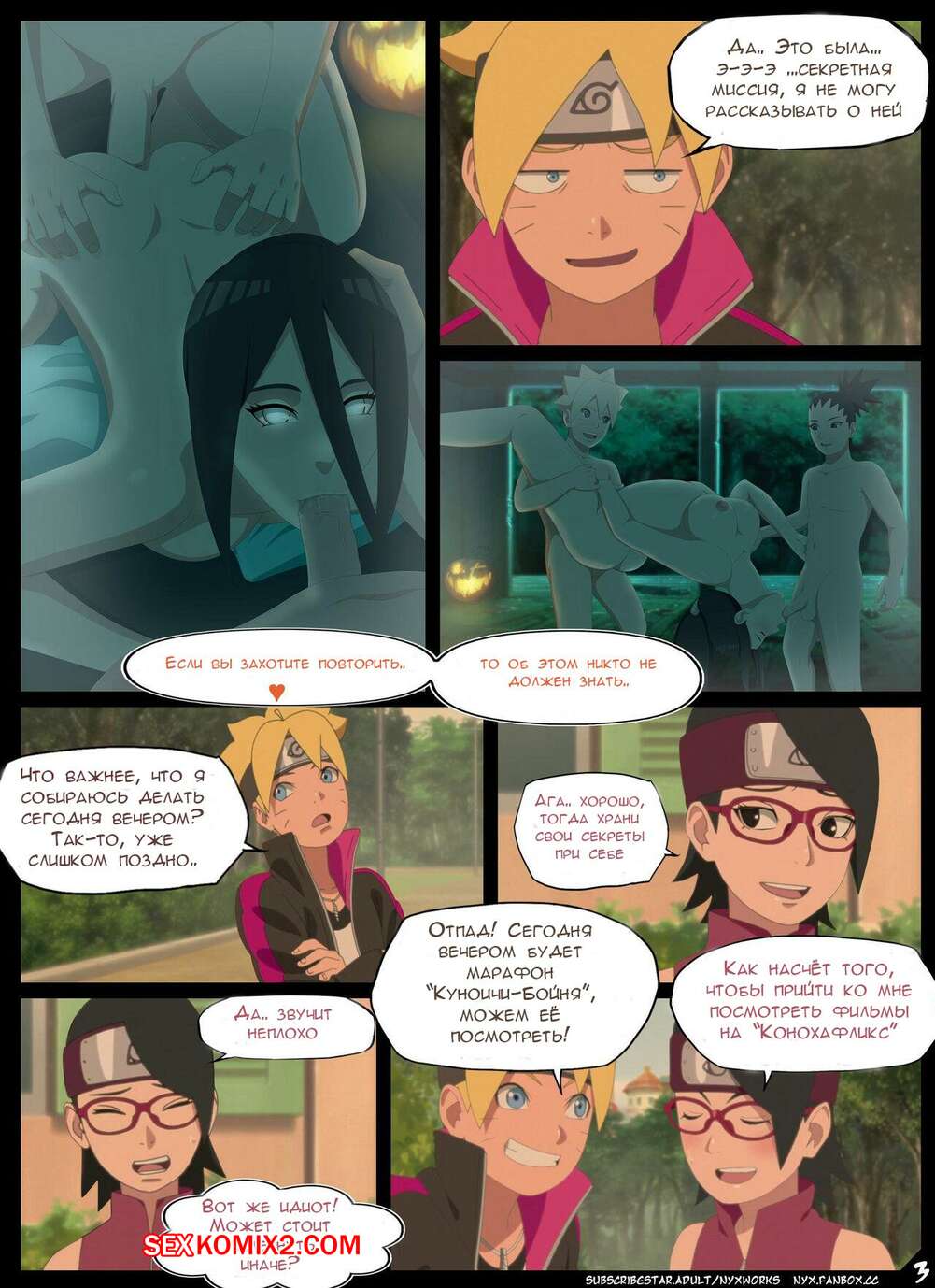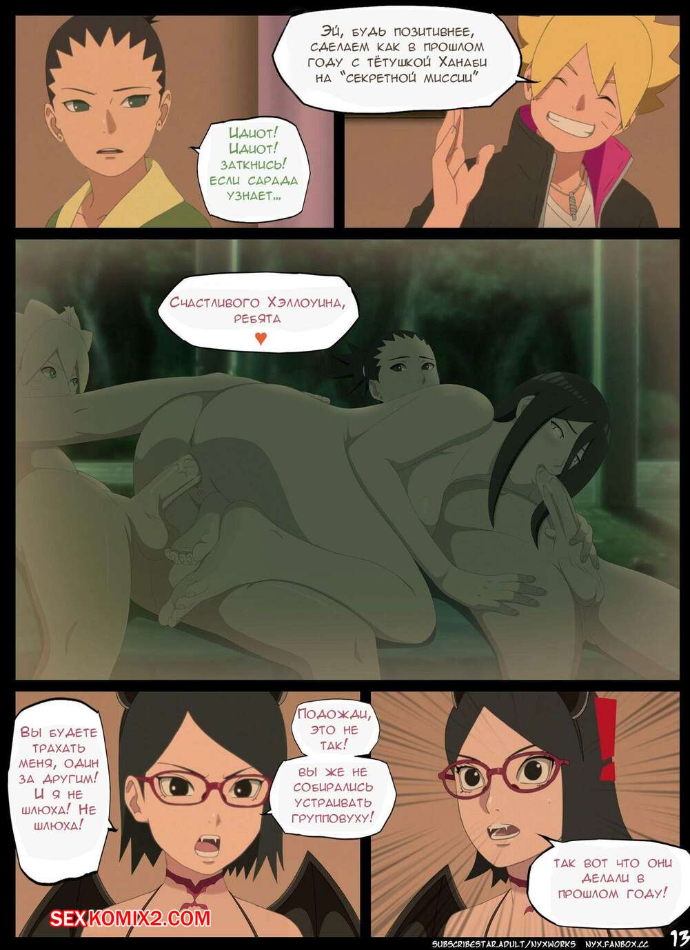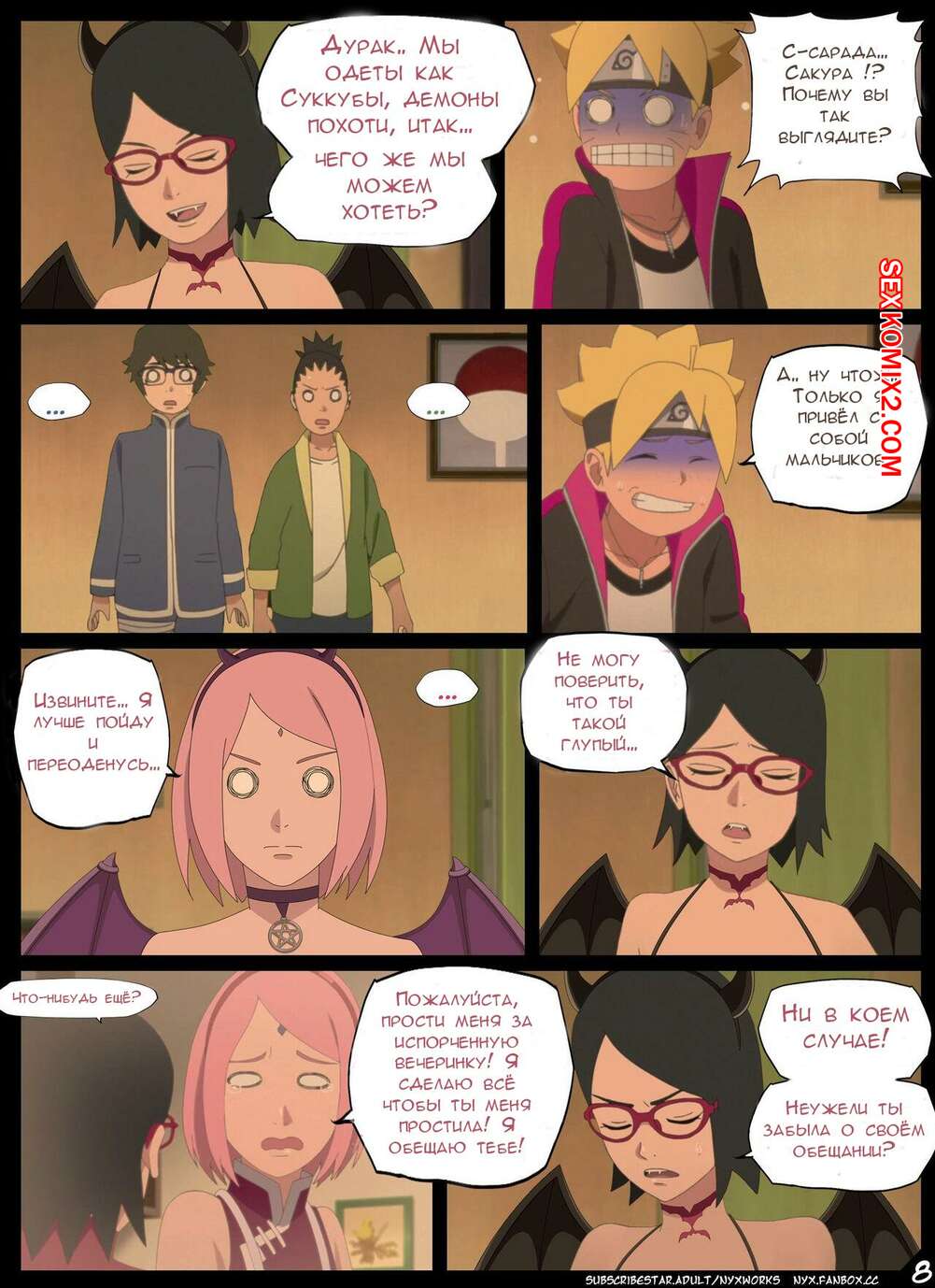 Порно комикс Наруто. Боруто. Ночь Красноглазого Суккуба. Nyx Сакура с Сарада стали одержимы сексом и хотят трахаться. Они пригласили к себе молодого парня и стали у него отсасывать, после чего дали ему себя хорошенько выебать.