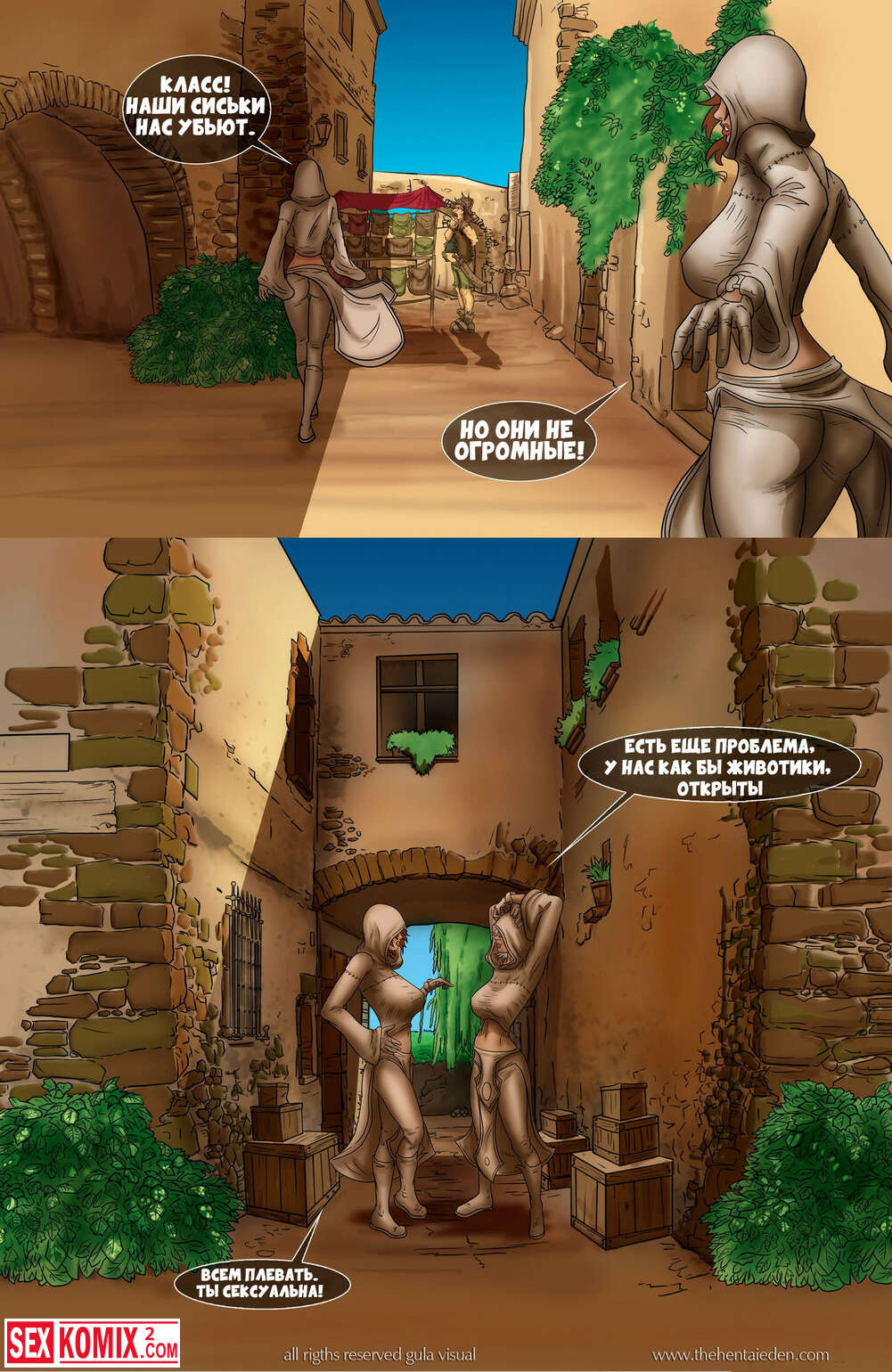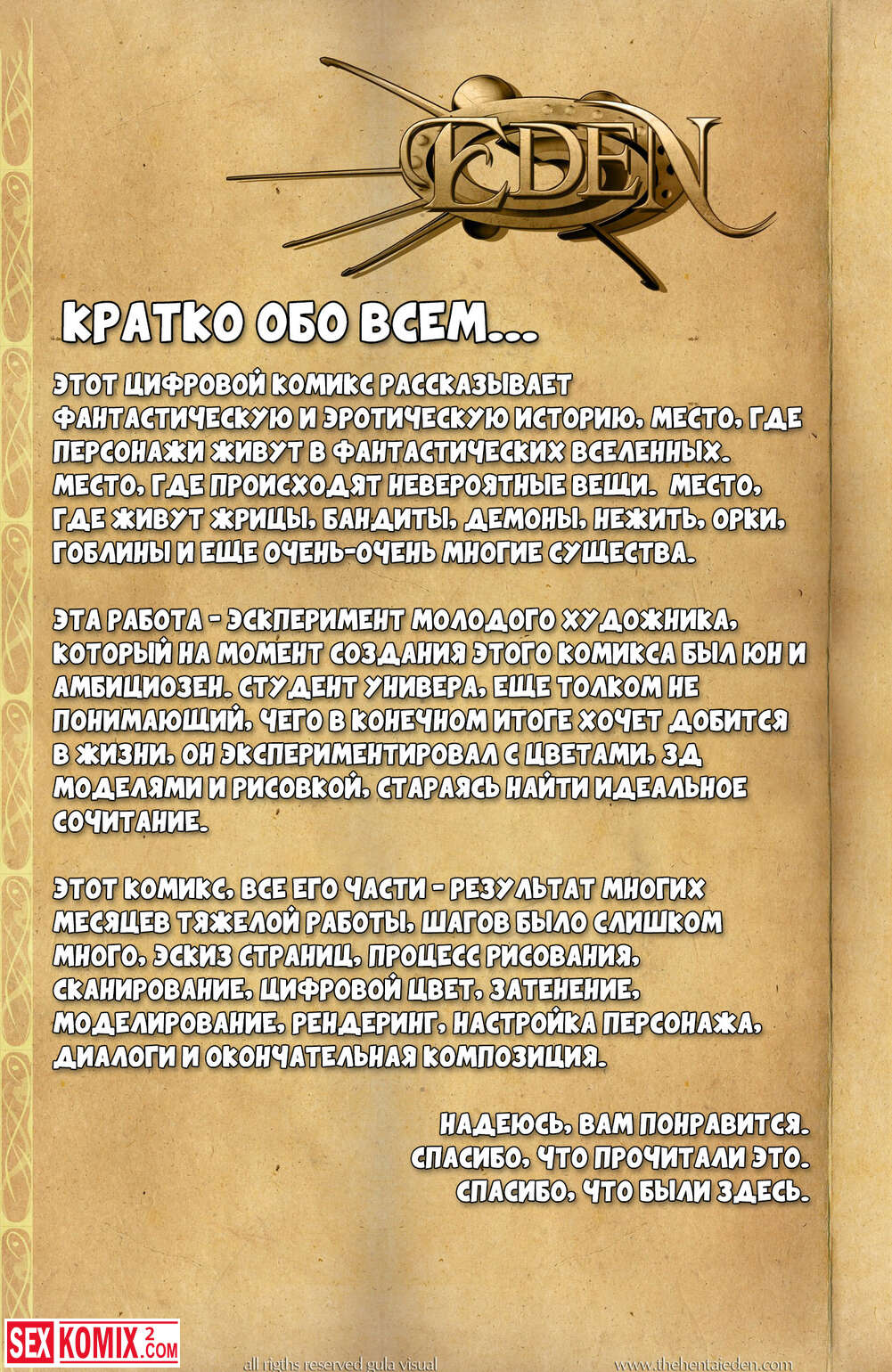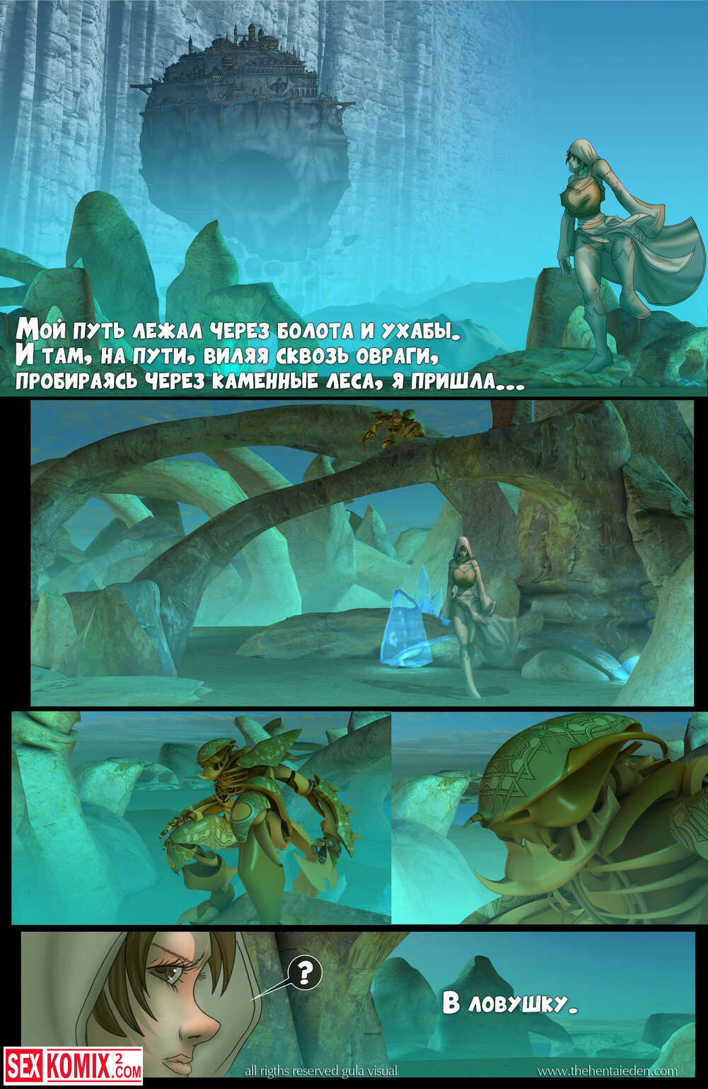 Порно комикс Eden. Фэнтези эротика. Волшебный мир, в котором за двумя девушками разбойницами гонится королевская стража, но девушки успешно скрываются.