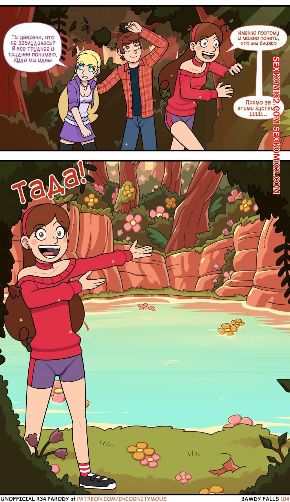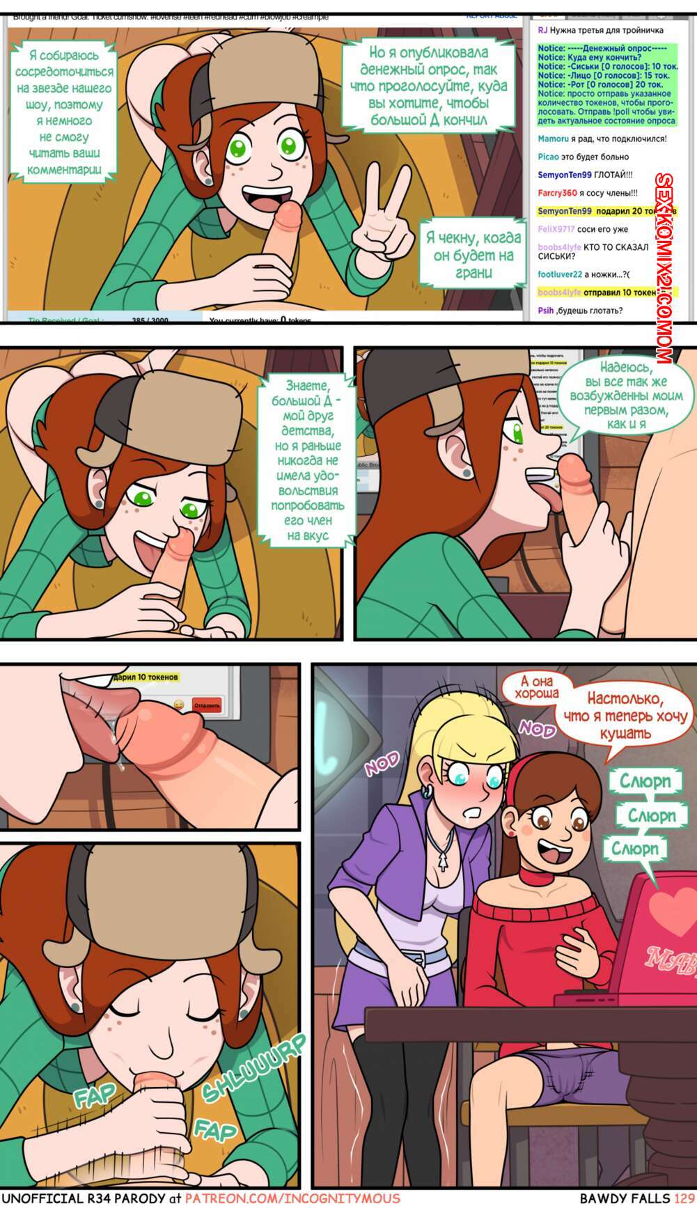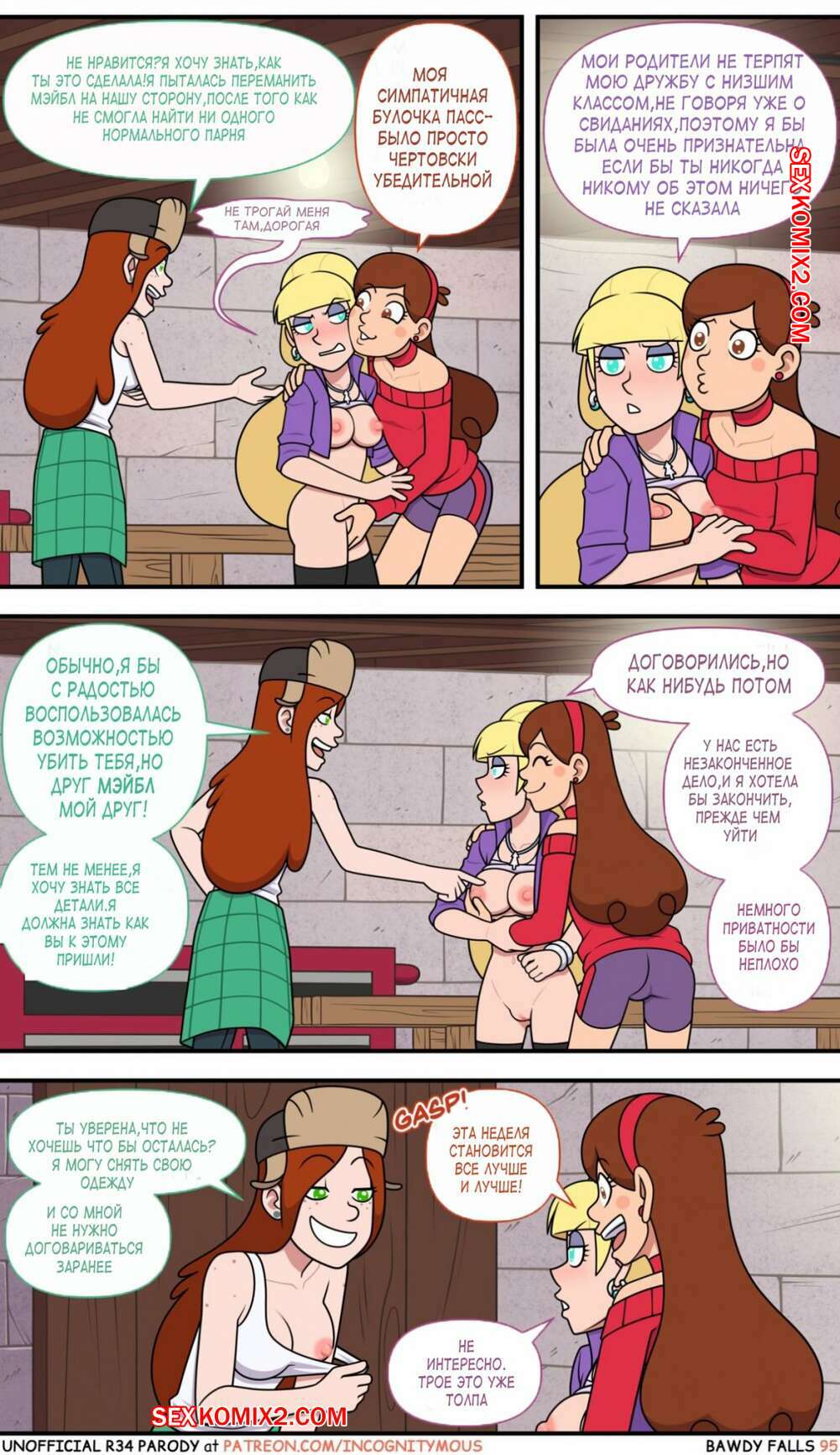 Порно комикс Gravity Falls. Боуди Фолс. Bawdy Falls. Incognitymous Горячие красотки просто без ума от большого члена Диппера. Девушка соблазняют его своими шикарными телами и хорошенько сосут большой хуй парня, после чего он ебет их пизденки.
