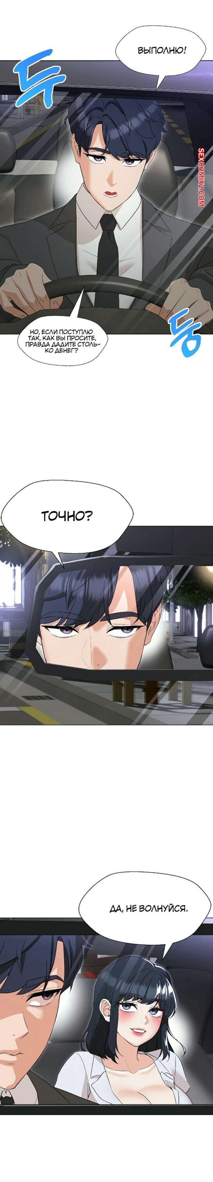 Порно комикс Хозяйка особняка, моя бывшая учительница. Часть 10 и 11 и 12 Сексуальная брюнетка была очень возбуждена и решила повеселиться с парнем в машине. Она встала на колени и стала дрочить сиськами хуй парня, после чего она хорошенько отсосала хуй парня.