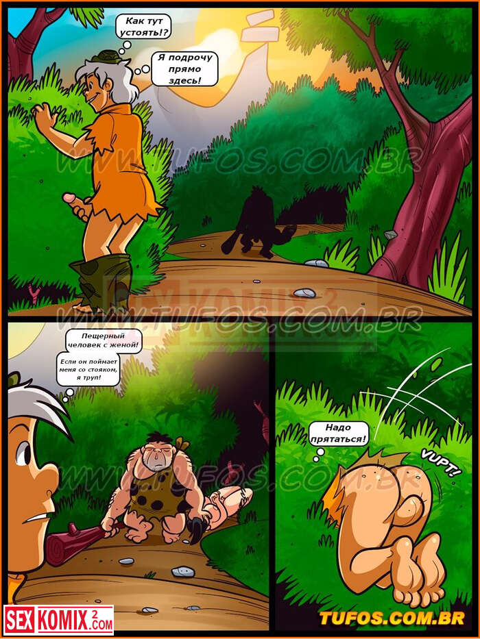 Порно комикс Флинстоуны. Часть 8. Парень подсматривал за женщиной как она писает и дрочил, но его чуть не поймал пещерный человек.