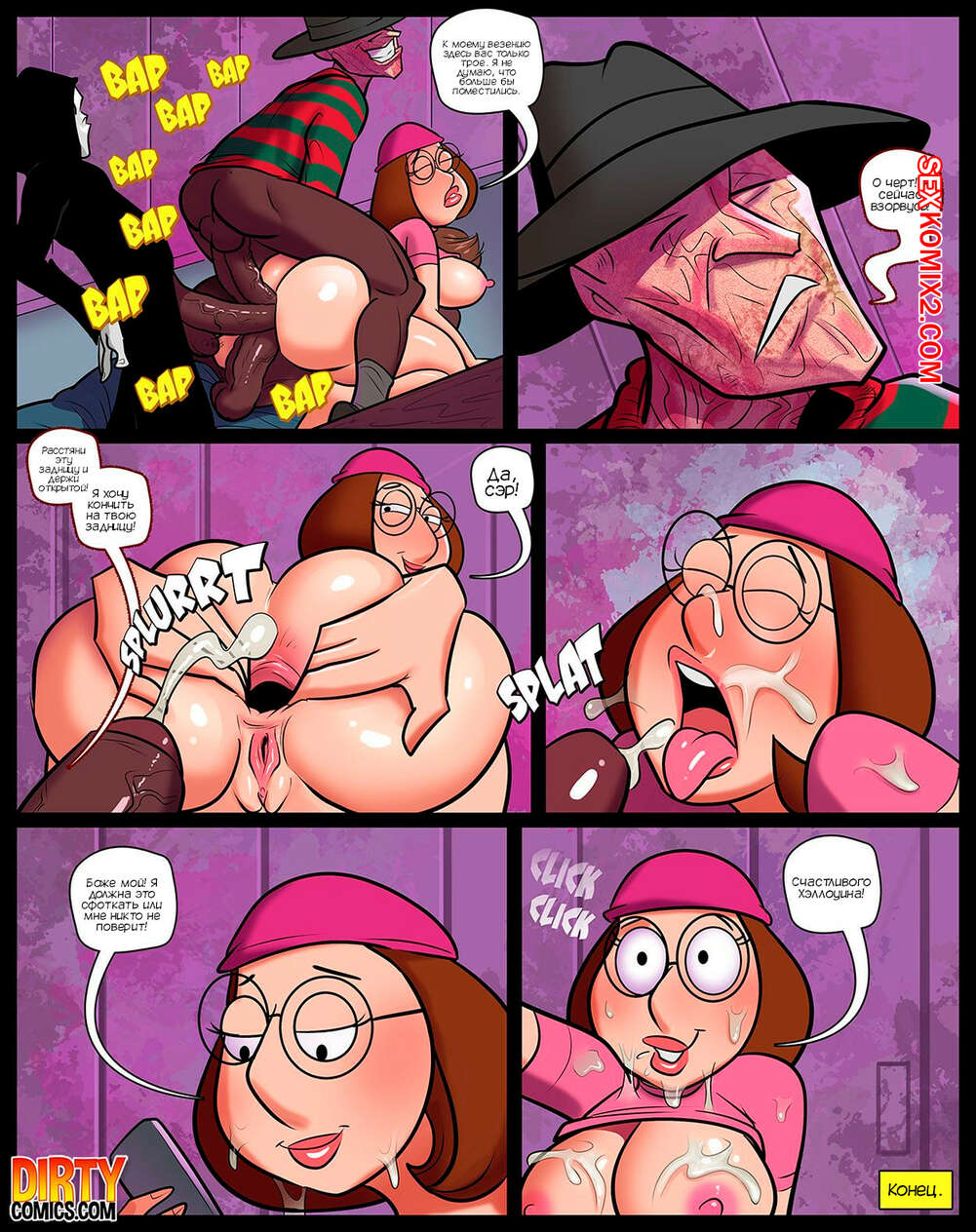 Порно комикс Гриффины. Крики Мэг. Mag Screems. Dirtycomics Парень в костюме Крика пришел в женскую раздевалку, чтобы напугать Мэг, но застал девушку в слезах, ведь она не может найти вторую половину. Парень решил утешить девушку и дал ей отсосать свой большой хуй.