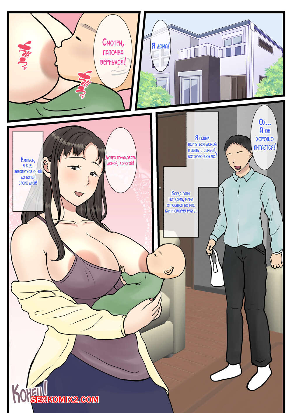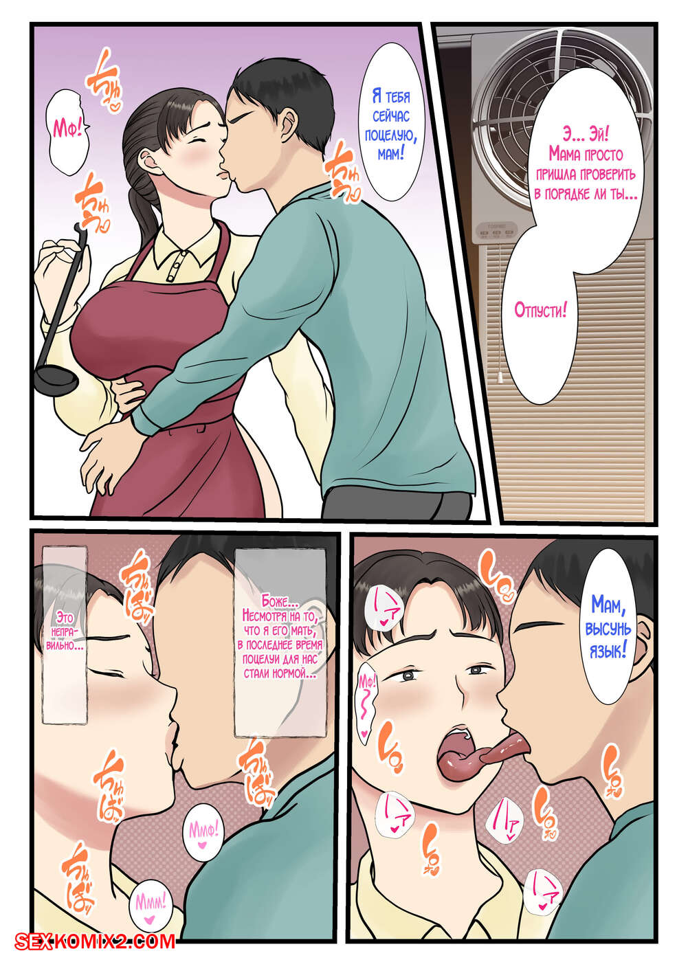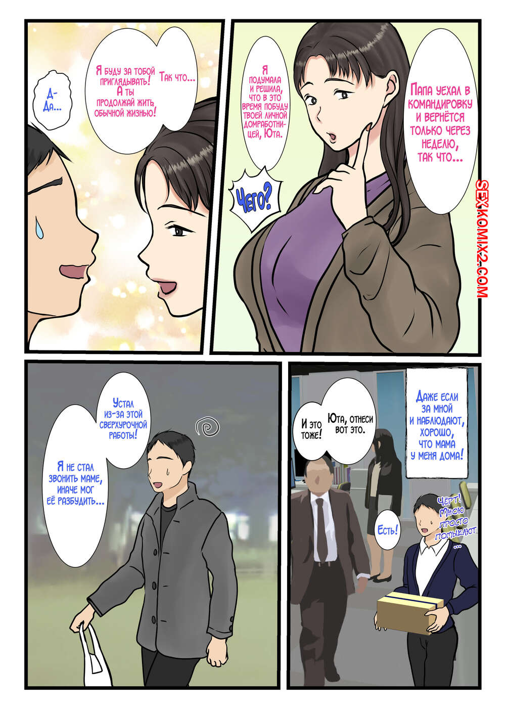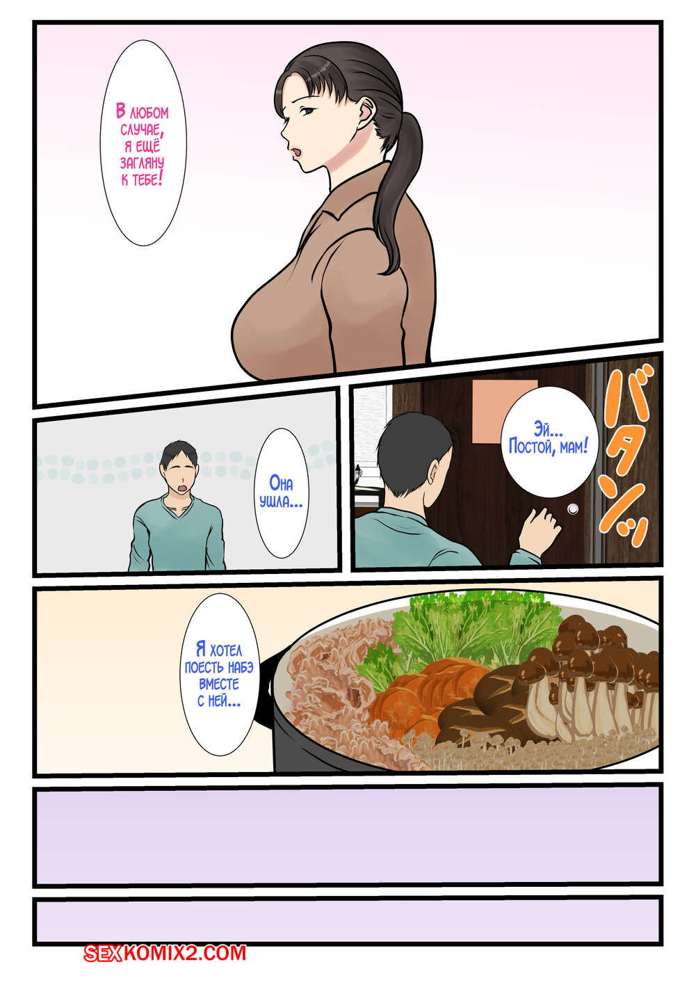 Порно комикс Я вызвал домработницу, а пришла моя мама. Часть 2. Benii Kenkyuujo Сисястая брюнетка милфа была очень возбуждена и решила повеселиться со своим сыном. Красотка разделась и отсосала большой хуй парня, после чего дала ему себя выебать и кончить в нее.