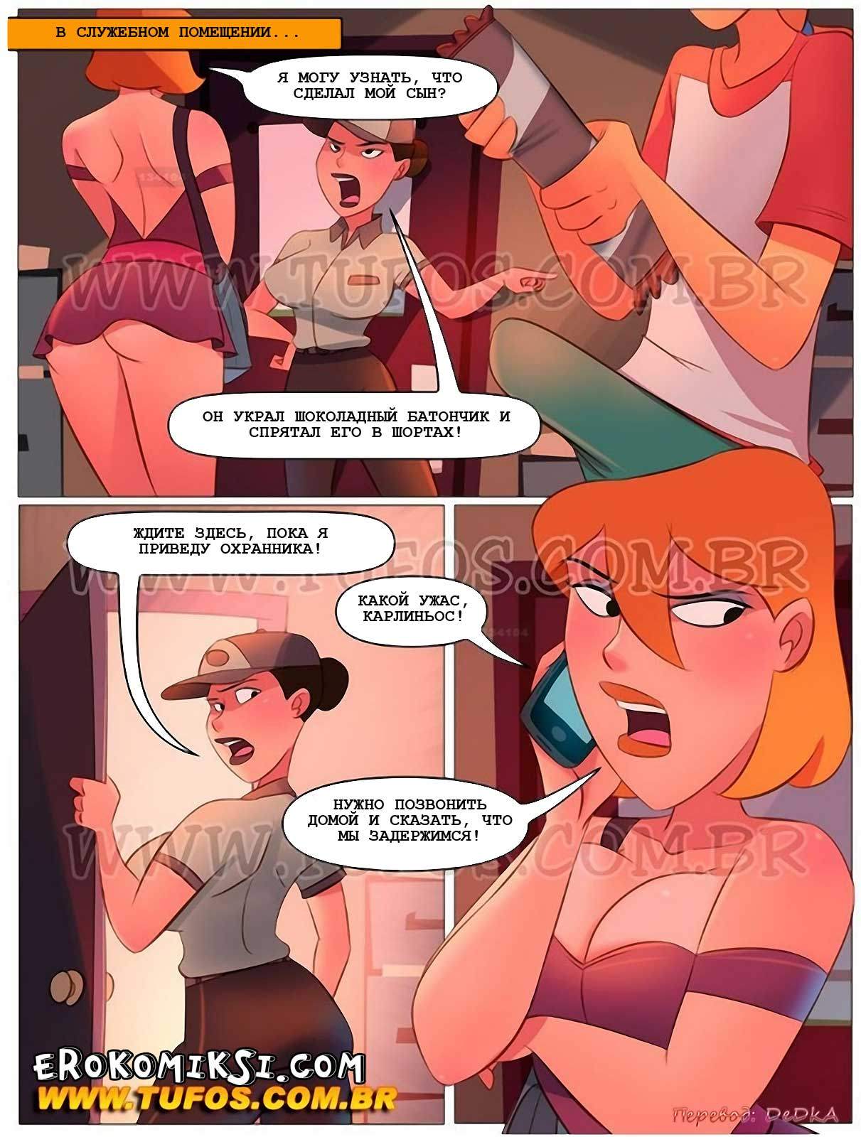 Смотреть порно комиксы «Похотливая семейка. Часть 32. Шоколадный батончик (Familia Sacana)». В этом сэкс комиксе грудастая мамочка со своим озабоченным парнем пошли в супермаркет за покупками. Пока женщина складывала нужные продукты в корзину, он глазел на проходящих мимо девушек в коротеньких платьях и из-за этого у него встал член в штанах. Охранница увидела его член и подумала, что это шоколадка, и что он её украл. Парня с его мамой завели в подсобное помещение, чтобы провести обыск и раздеться, после этого обыск превратился в похотливую оргию.